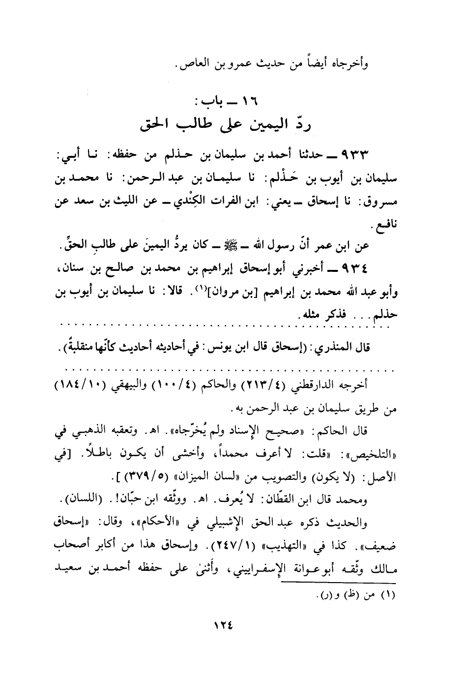 عن ابن عمر أنّ رسول الله - صلى الله عليه وسلم - كان يردُّ اليمينَ على طالبِ الحقِّ.