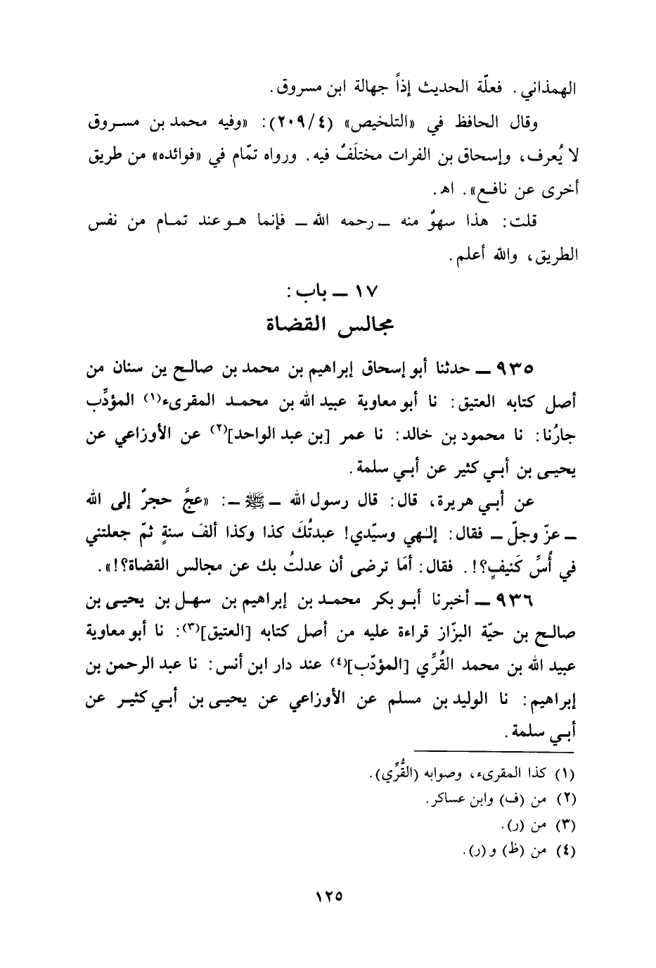 936 - أخبرنا أبو بكر محمد بن إبراهيم بن سهل بن يحيى بن صالح بن حيّة البزّاز قراءة عليه من أصل كتابه [العتيق] (¬3): نا أبو معاوية عبيد الله بن محمد القُرِّي [المؤدّب] (¬4) عند دار ابن أنس: نا عبد الرحمن بن إبراهيم: نا الوليد بن مسلم عن الأوزاعي عن يحيى بن أبي كثير عن أبي سلمة.
