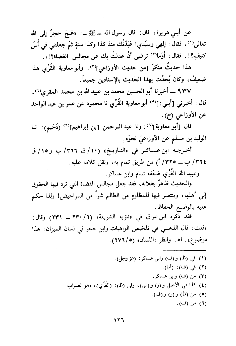 937 - أخبرنا أبو الحسين محمد بن عبيد الله بن محمد المقري (¬4)، قال: أخبرني [أبي:] (¬5) أبو معاوية القُرِّي نا محمود عن عمر بن عبد الواحد عن الأوزاعي (ح).