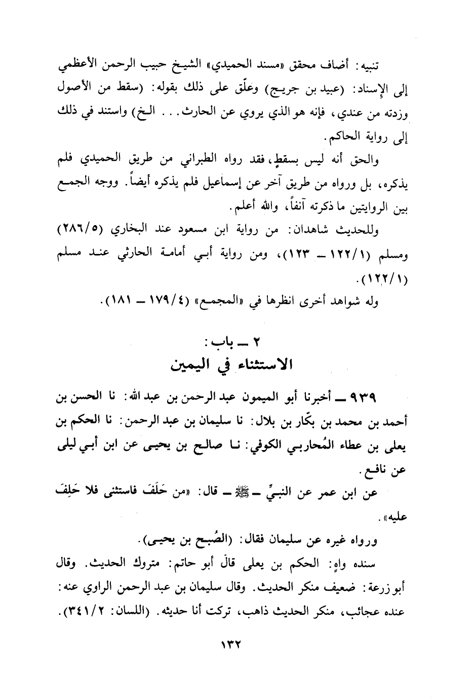 تنبيه: أضاف محقق "مسند الحميدي" الشيخ حبيب الرحمن الأعظمي إلى الإِسناد: (عبيد بن جريج) وعلّق على ذلك بقوله: (سقط من الأصول وزدته من عندي، فإنه هو الذي يروي عن الحارث ... الخ) واستند في ذلك إلى رواية الحاكم.