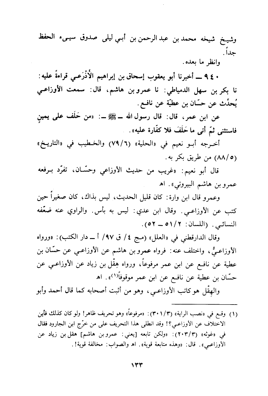 وقال الدارقطني في "العلل" (مج 4/ ق 97/ أ - دار الكتب): "ورواه الأوزاعيُّ، واختلف عنه: فرواه عمرو بن هاشم عن الأوزاعي عن حسّان بن عطية عن نافع عن ابن عمر مرفوعًا، ورواه هِقْل بن زياد عن الأوزاعي عن حسّان بن عطية عن نافع عن ابن عمر موقوفًا (¬1) ". أهـ