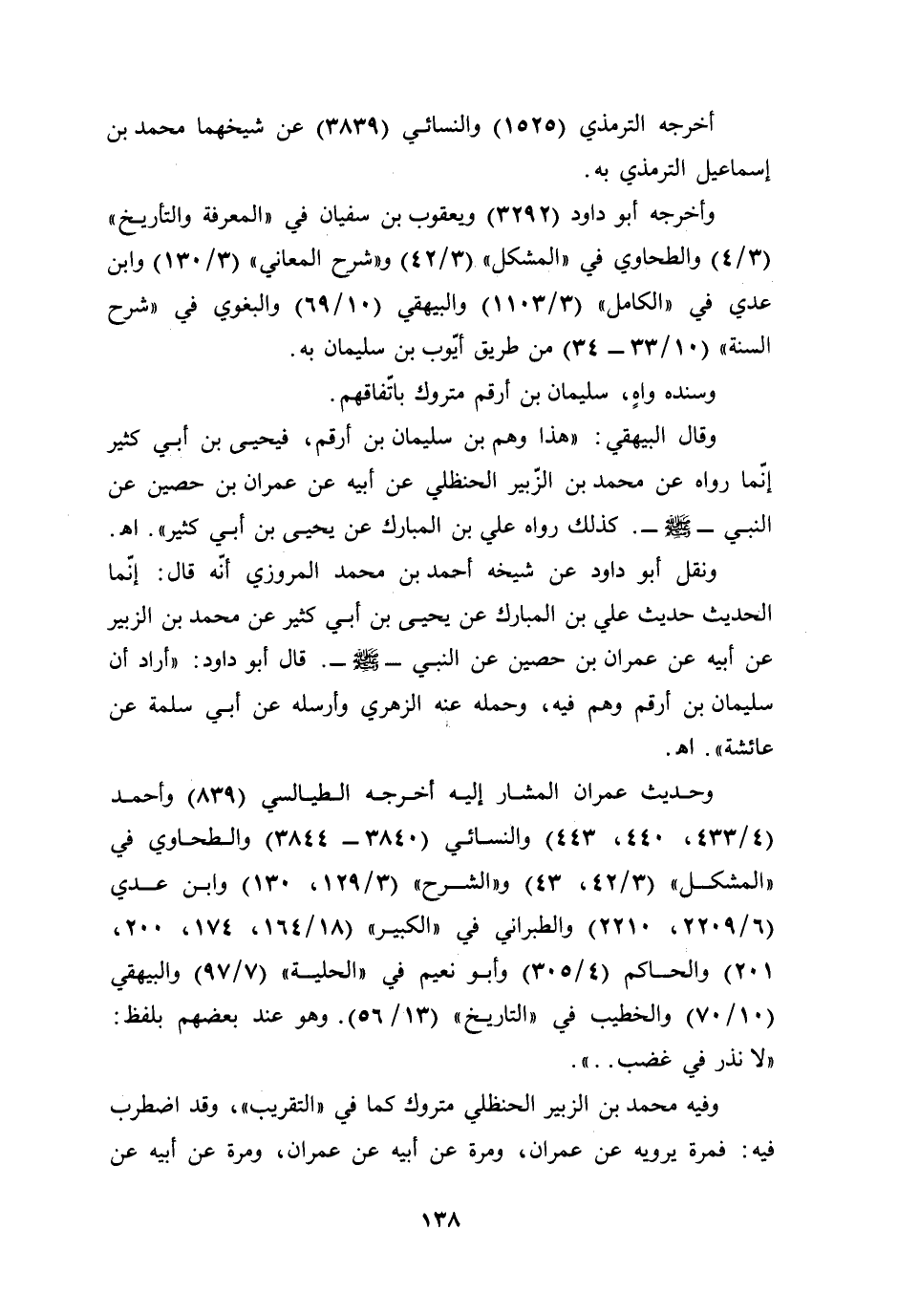 وقال البيهقي: "هذا وهم بن سليمان بن أرقم، فيحيى بن أبي كثير إنّما رواه عن محمد بن الزّبير الحنظلي عن أبيه عن عمران بن حصين عن النبي - صلى الله عليه وسلم -. كذلك رواه علي بن المبارك عن يحيى بن أبي كثير". أهـ.