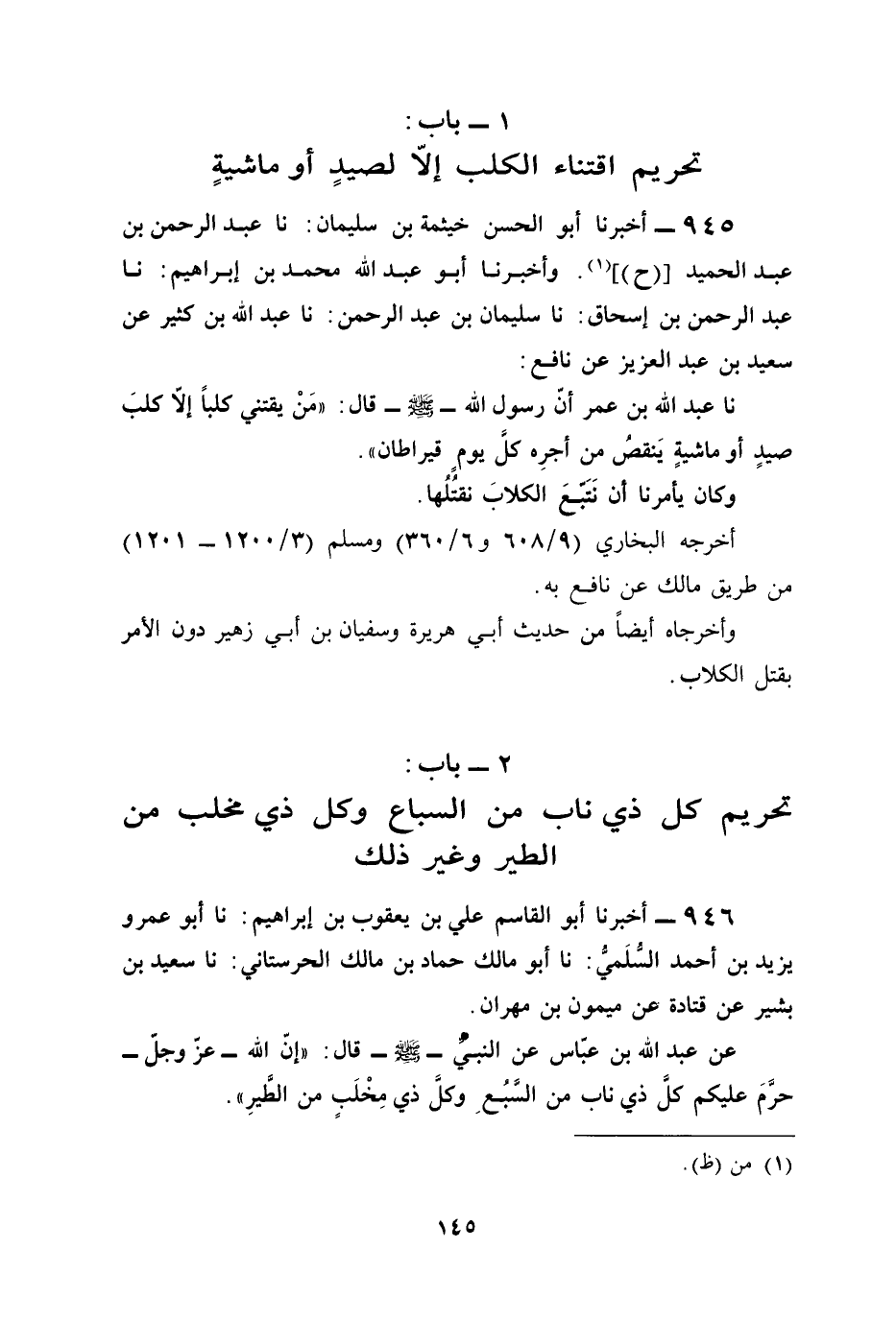 نا عبد الله بن عمر أنّ رسول الله - صلى الله عليه وسلم - قال: "مَنْ يقتني كلبًا إلّا كلبَ صيدٍ أو ماشيةٍ يَنقصُ من أجرِه كلَّ يومٍ قيراطان".