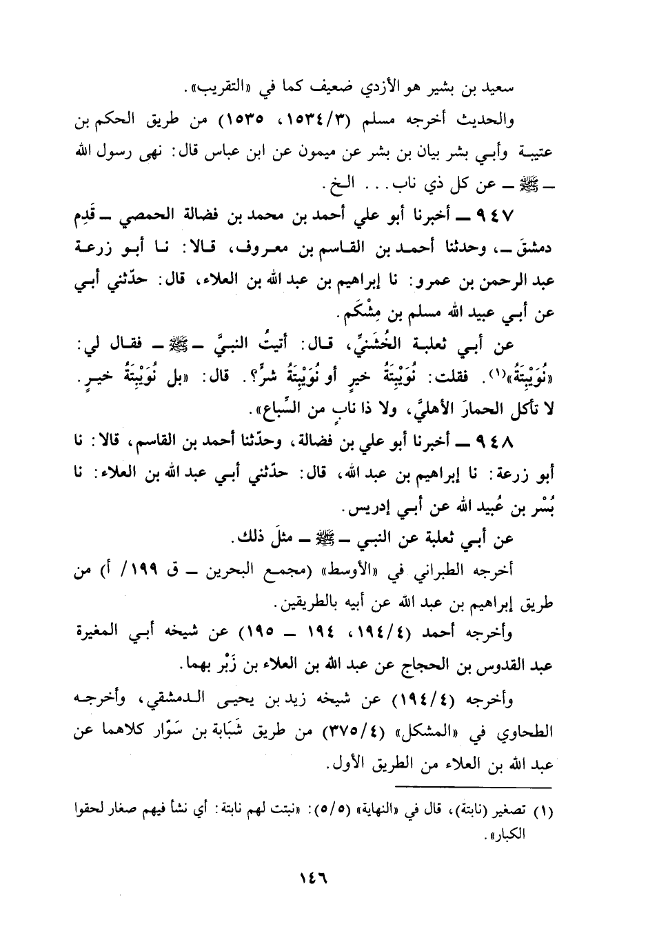 عن أبي ثعلبة الخُشَنيِّ، قال: أتيتُ النبي - صلى الله عليه وسلم - فقال لي: "نُوَيْبِتَةُ" (¬1). فقلت: نُوَيْبِتَةُ خيرٍ أو نُوَيْبِتَةُ شرٍّ؟. قال: "بل نُوَيْبِتَةُ خيرٍ. لا تأكل الحمارَ الأهليَّ، ولا ذا نابٍ من السِّباع".