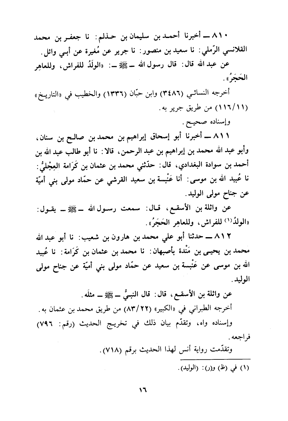 810 - أخبرنا أحمد بن سليمان بن حذلم: نا جعفر بن محمَّد القلانسي الرّملي: نا سعيد بن منصور: نا جرير عن مُغيرة عن أبي وائل.