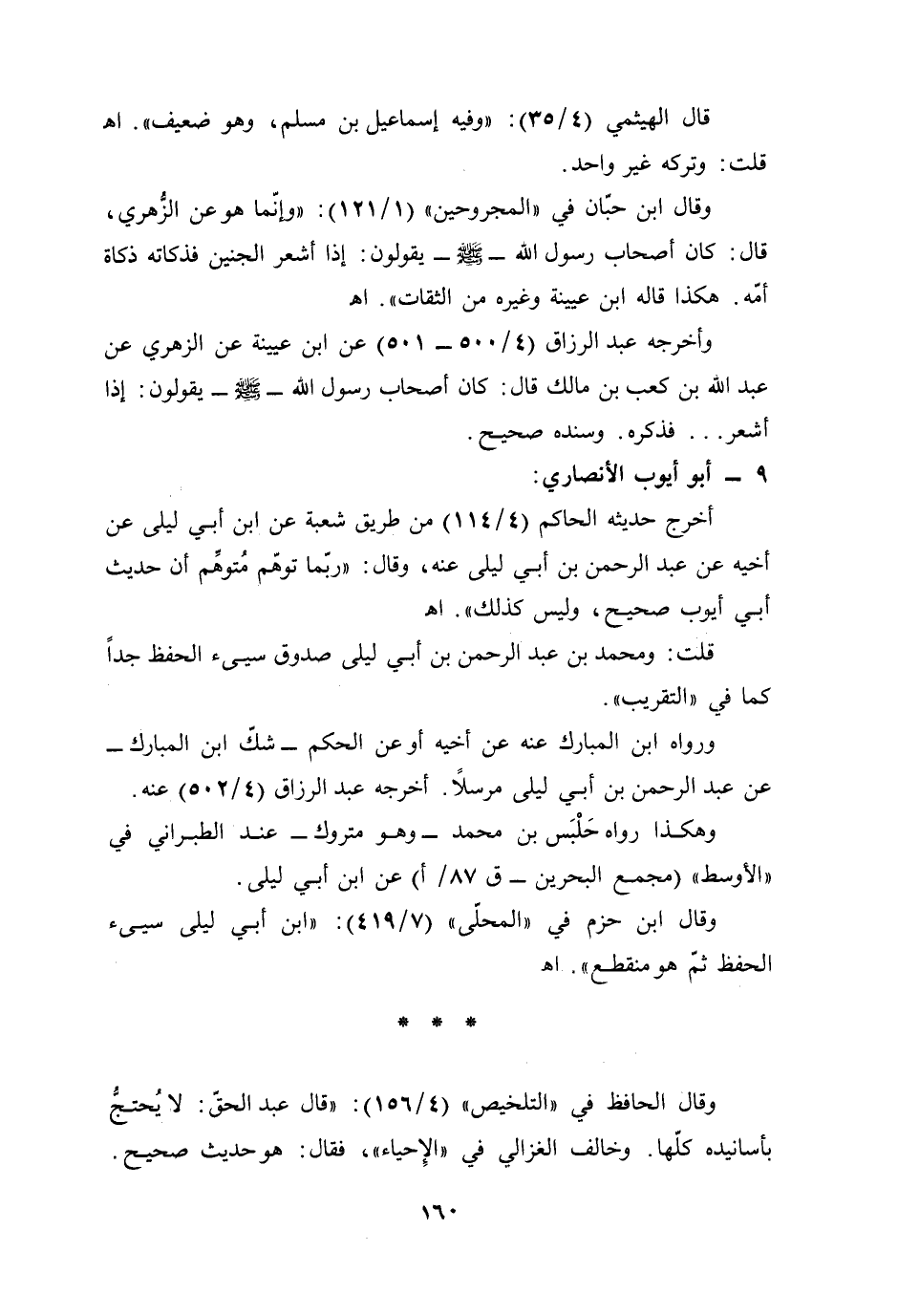 وقال ابن حبّان في "المجروحين" (1/ 121): "وإنّما هو عن الزُّهري، قال: كان أصحاب رسول الله - صلى الله عليه وسلم - يقولون: إذا أشعر الجنين فذكاته ذكاة أمّه. هكذا قاله ابن عيينة وغيره من الثقات". أهـ