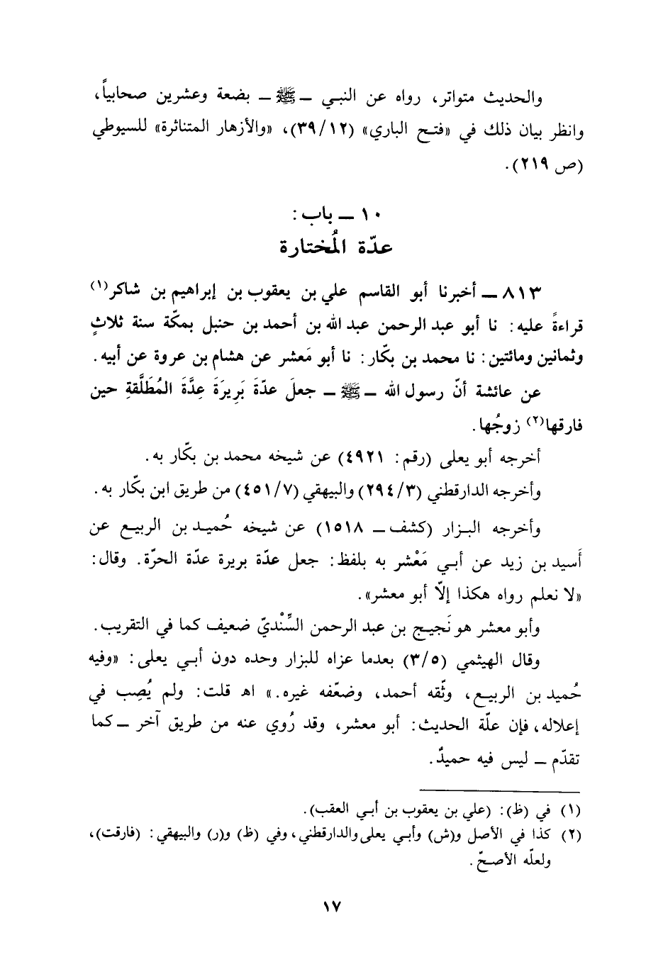 وأخرجه البزار (كشف- 1518) عن شيخه حُميد بن الربيع عن أَسيد بن زيد عن أبي مَعْشر به بلفظ: جعل عدة بريرة عدَّة الحرّة. وقال: "لا نعلم رواه هكذا إلَّا أبو معشر".