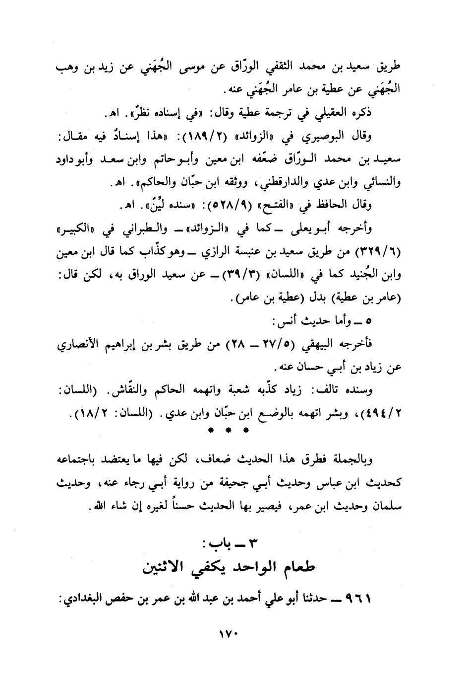 وأخرجه أبو يعلى -كما في "الزوائد"- والطبراني في "الكبير" (6/ 329) من طريق سعيد بن عنبسة الرازي -وهو كذّاب كما قال ابن معين وابن الجُنيد كما في "اللسان" (3/ 39) - عن سعيد الوراق به، لكن قال: (عامر بن عطية) بدل (عطية بن عامر).
