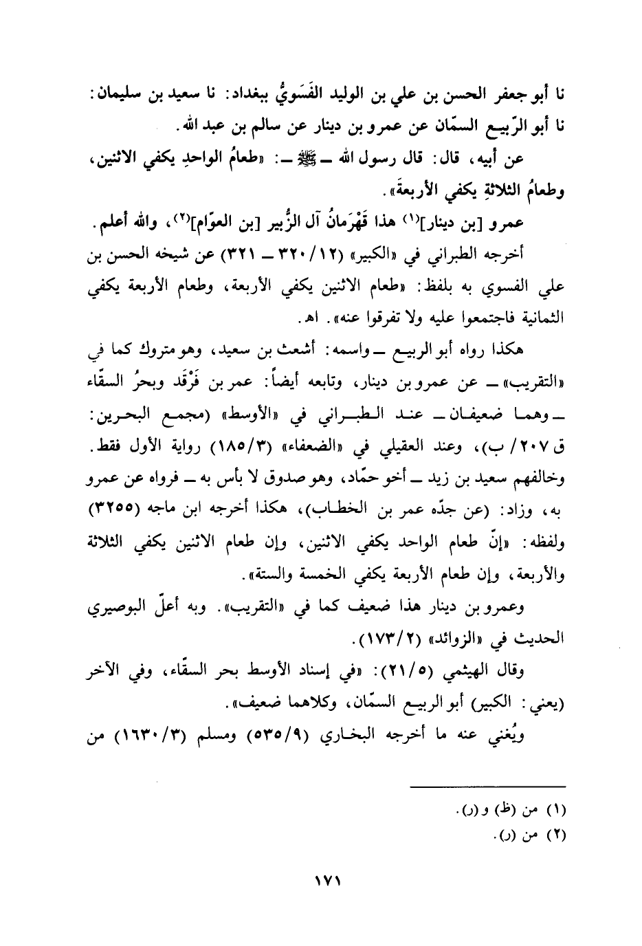 هكذا رواه أبو الربيع -واسمه: أشعث بن سعيد، وهو متروك كما في "التقريب"- عن عمرو بن دينار، وتابعه أيضًا: عمر بن فَرْقَد وبحرُ السقّاء -وهما ضعيفان- عند الطبراني في "الأوسط" (مجمع البحرين: ق 207/ ب)، وعند العقيلي في "الضعفاء" (3/ 185) رواية الأول فقط. وخالفهم سعيد بن زيد -أخو حمّاد، وهو صدوق لا بأس به- فرواه عن عمرو به، وزاد: (عن جدّه عمر بن الخطاب)، هكذا أخرجه ابن ماجه (3255) ولفظه: "إنّ طعام الواحد يكفي الاثنين، وإن طعام الاثنين يكفي الثلاثة والأربعة، وإن طعام الأربعة يكفي الخمسة والستة".