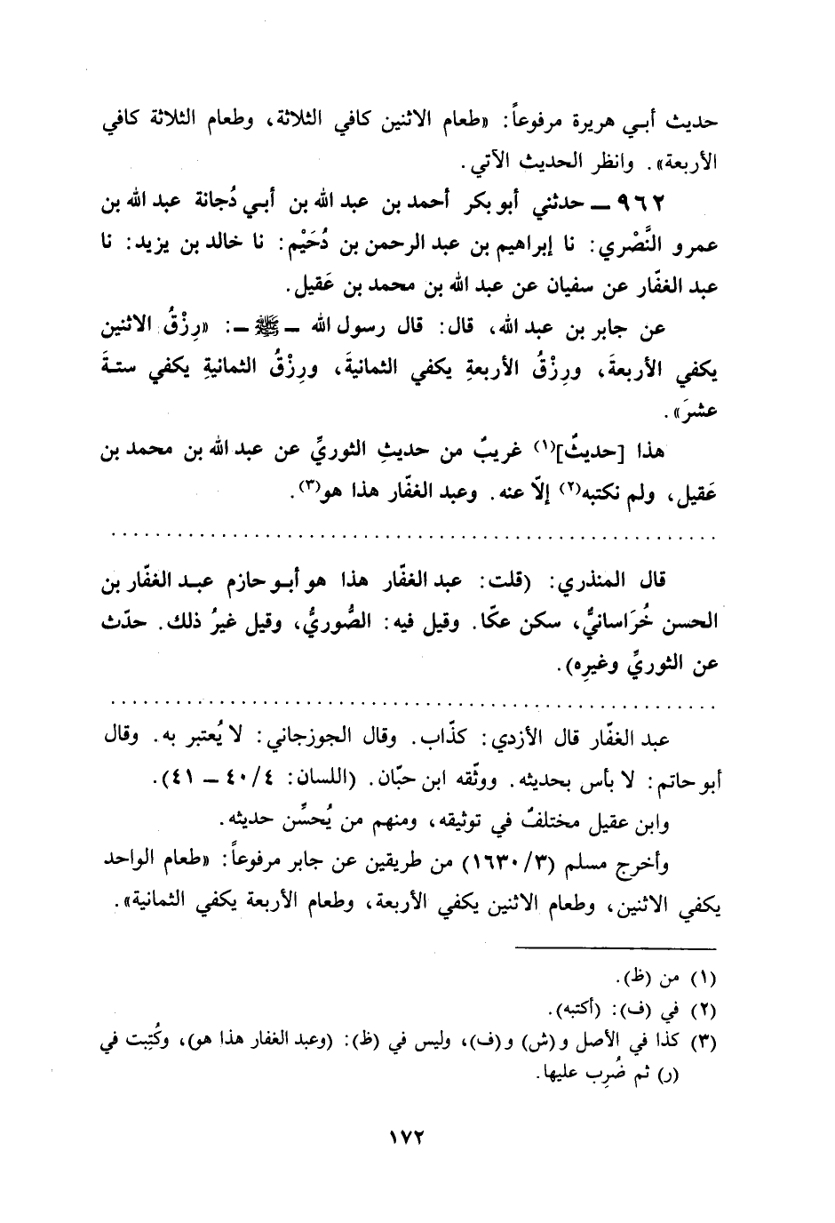 قال المنذري: (قلت: عبد الغفّار هذا هو أبو حازم عبد الغفّار بن الحسن خُرَاسانيّ، سكن عكّا. وقيل فيه: الصُّوريُّ، وقيل غيرُ ذلك. حدّث عن الثوريِّ وغيرهِ).