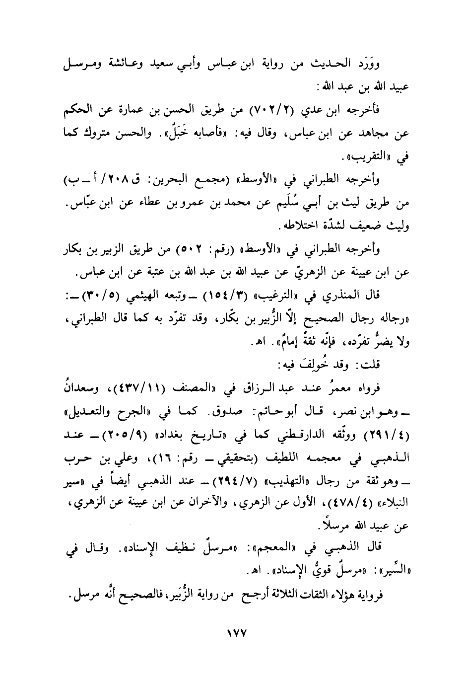 فرواية هؤلاء الثقات الثلاثة أرجح من رواية الزُّبَير، فالصحيح أنَّه مرسل.