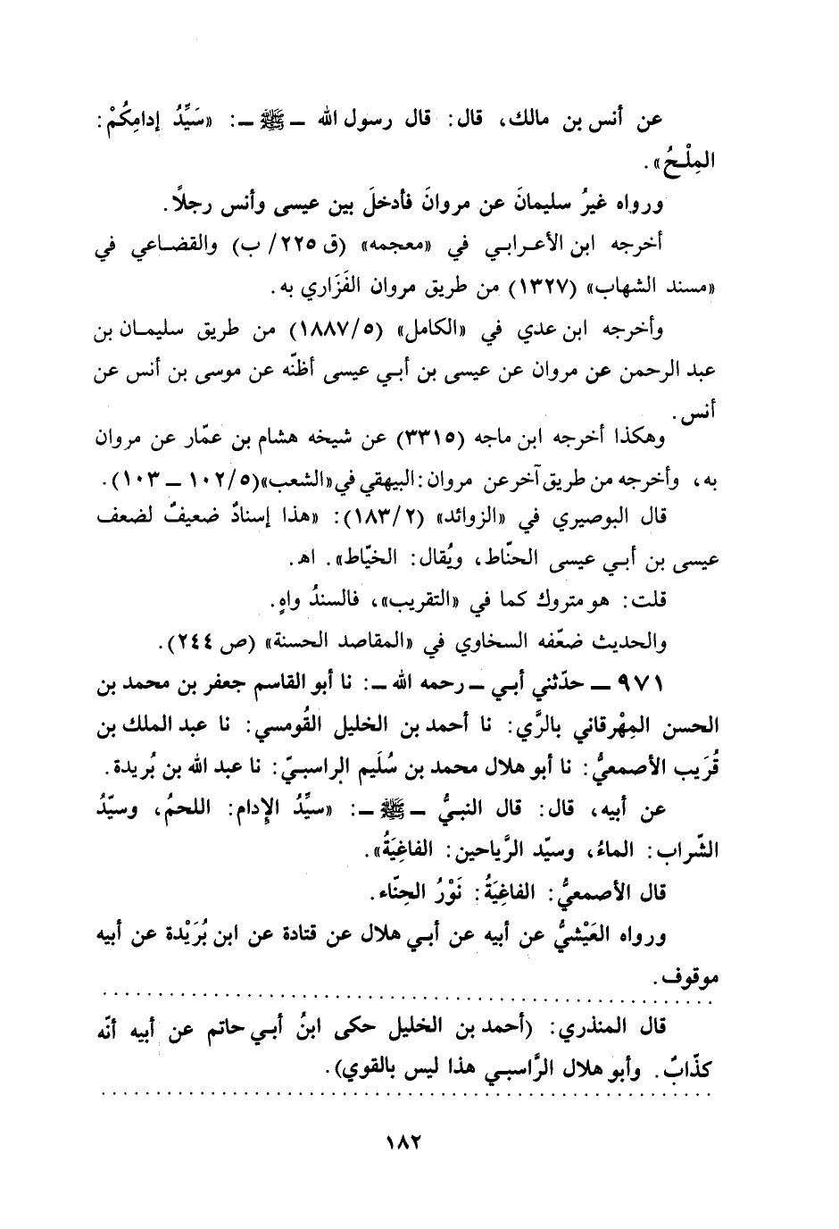 971 - حدّثني أبي -رحمه الله-: نا أبو القاسم جعفر بن محمد بن الحسن المِهْرقاني بالرَّي: نا أحمد بن الخليل القُومسي: نا عبد الملك بن قُرَيب الأصمعيُّ: نا أبو هلال محمد بن سُلَيم الراسبيّ: نا عبد الله بن بُريدة.