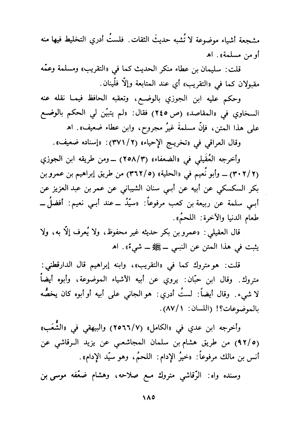 وحكم عليه ابن الجوزي بالوضع، وتعقبه الحافظ فيما نقله عنه السخاوي في "المقاصد" (ص 245) فقال: "لم يتبيّن لي الحكم بالوضع على هذا المتن، فإنّ مسلمةَ غيرُ مجروح، وابن عطاء ضعيف". أهـ