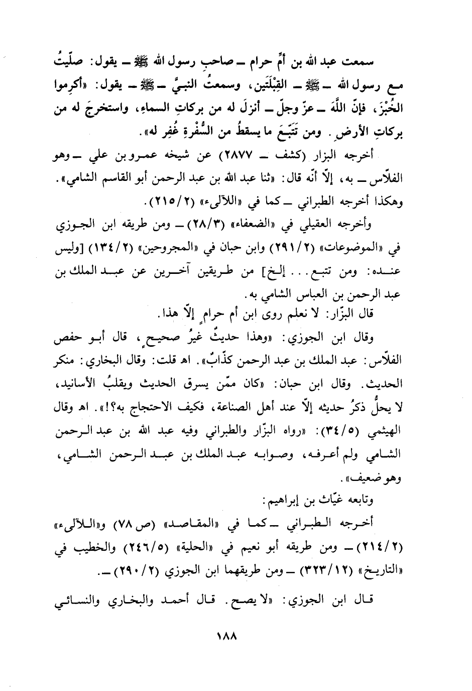 وقال ابن الجوزي: "وهذا حديثٌ غَيرُ صحيحٍ، قال أبو حفص الفلّاس: عبد الملك بن عبد الرحمن كذّابٌ". أهـ قلت: وقال البخاري: منكر الحديث. وقال ابن حبان: "كان ممّن يسرق الحديث ويقلبُ الأسانيد، لا يحلُّ ذكرُ حديثه إلّا عند أهل الصناعة، فكيف الاحتجاج به؟! ". أهـ وقال الهيثمي (5/ 34): "رواه البزّار والطبراني وفيه عبد الله بن عبد الرحمن الشامي ولم أعرفه، وصوابه عبد الملك بن عبد الرحمن الشامي، وهو ضعيف".