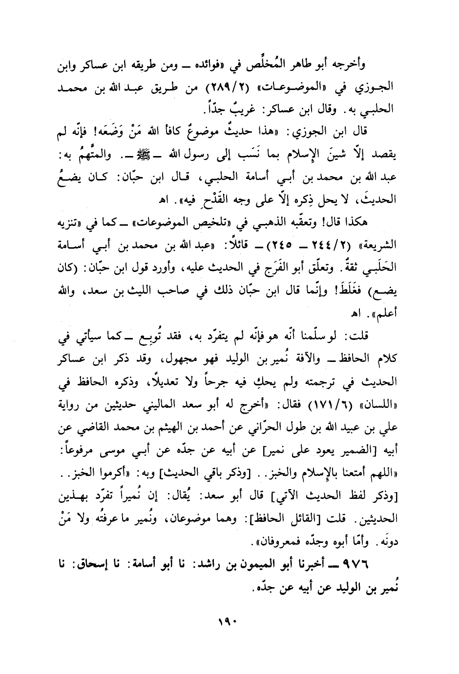 976 - أخبرنا أبو الميمون بن راشد: نا أبو أسامة: نا إسحاق: نا نُمير بن الوليد عن أبيه عن جدّه.