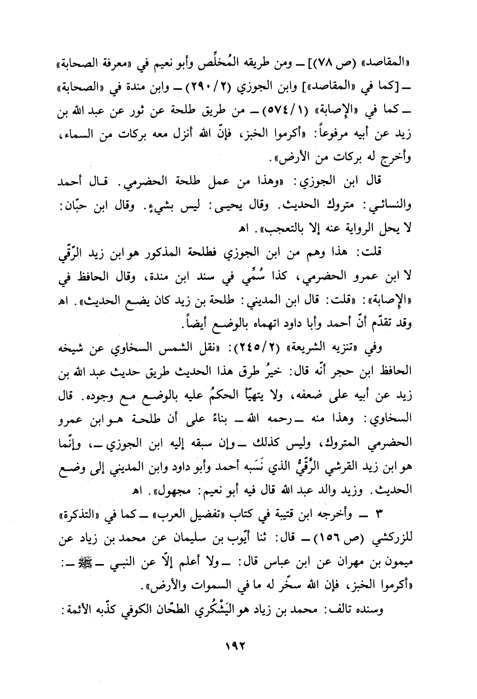 قلت: هذا وهم من ابن الجوزي فطلحة المذكور هو ابن زيد الرّقّي لا ابن عمرو الحضرمي، كذا سُمِّي في سند ابن مندة، وقال الحافظ في "الإِصابة": "قلت: قال ابن المديني: طلحة بن زيد كان يضع الحديث". أهـ وقد تقدّم أنّ أحمد وأبا داود اتهماه بالوضع أيضًا.