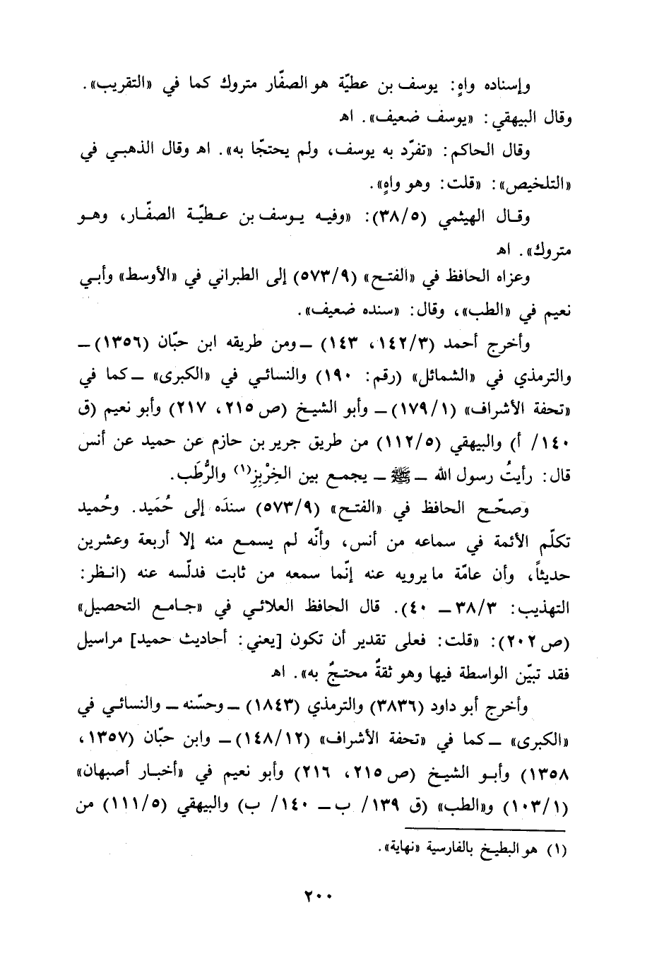 وصحّح الحافظ في "الفتح" (9/ 573) سندَه إلى حُمَيد. وحُميد تكلّم الأئمة في سماعه من أنس، وأنّه لم يسمع منه إلا أربعة وعشرين حديثًا، وأن عامّة ما يرويه عنه إنمّا سمعه من ثابت فدلّسه عنه (انظر: التهذيب: 3/ 38 - 40). قال الحافظ العلائي في "جامع التحصيل" (ص 202): "قلت: فعلى تقدير أن تكون [يعني: أحاديث حميد] مراسيل فقد تبيّن الواسطة فيها وهو ثقةٌ محتجٌ به". أهـ