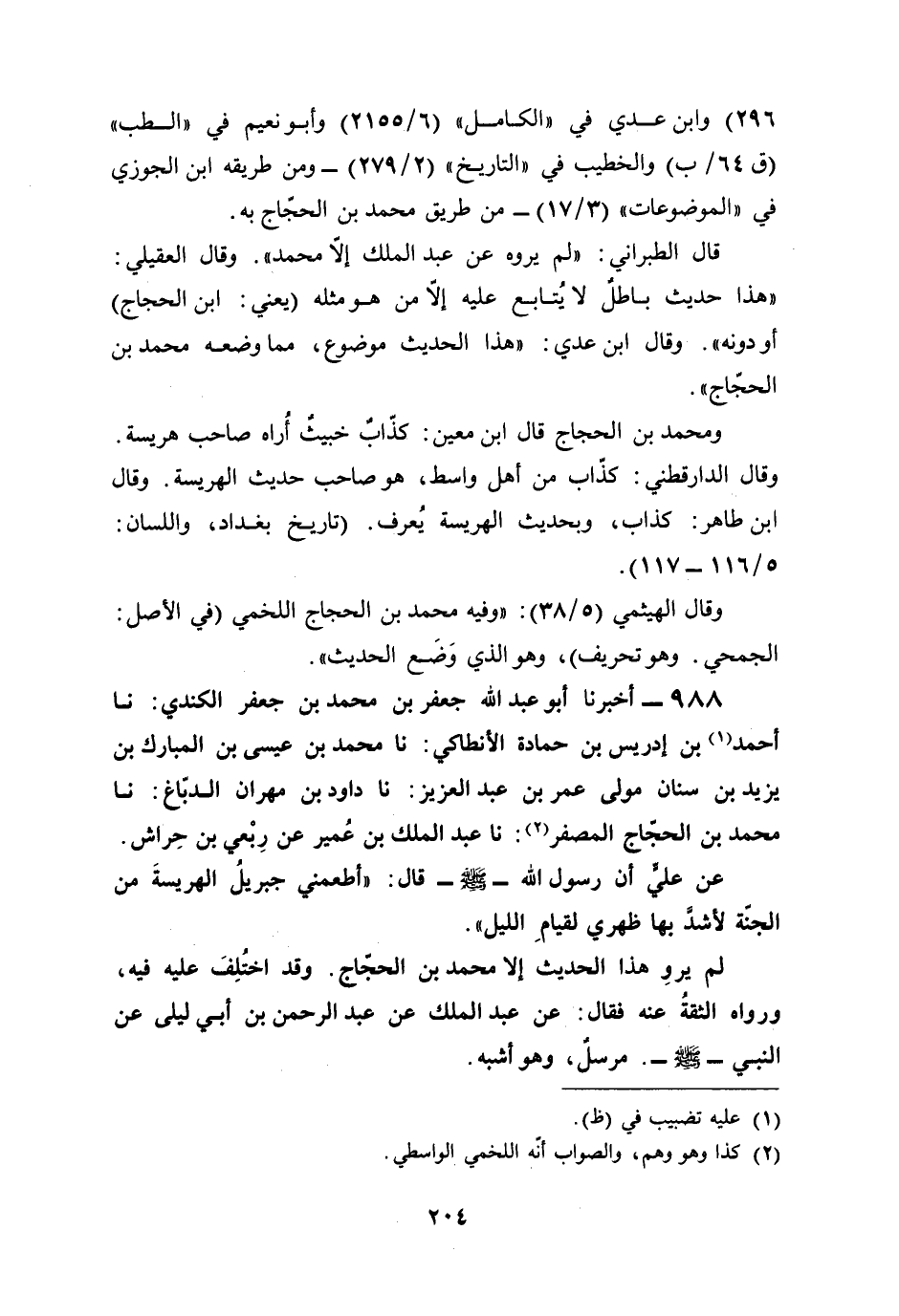 ومحمد بن الحجاج قال ابن معين: كذّابٌ خبيثٌ أُراه صاحب هريسة. وقال الدارقطني: كذّاب من أهل واسط، هو صاحب حديث الهريسة. وقال ابن طاهر: كذاب، وبحديث الهريسة يُعرف. (تاريخ بغداد، واللسان: 5/ 116 - 117).