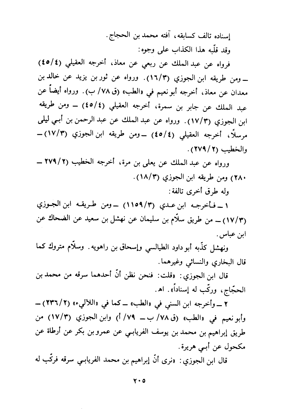 قال ابن الجوزي: "قلت: فنحن نظن أنّ أحدهما سرقه من محمد بن الحجّاج، وركّب له إسنادًا". أهـ.