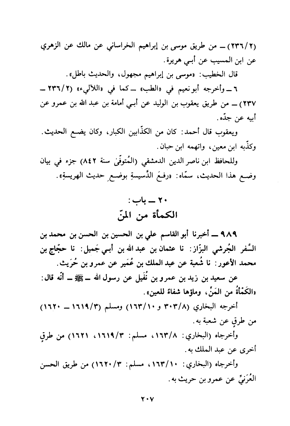 989 - أخبرنا أبو القاسم علي بن الحسين بن الحسن بن محمد بن السَّفر الجُرشي البزّاز: نا عثمان بن عبد الله بن أبي جَميل: نا حجّاج بن محمد الأعور: نا شُعبة عن عبد الملك بن عُمَير عن عمرو بن حُرَيث.