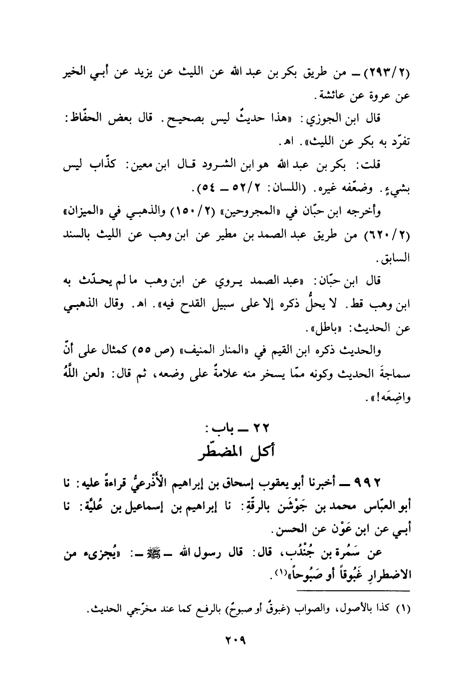 قلت: بكر بن عبد الله هو ابن الشرود قال ابن معين: كذّاب ليس بشيءٍ. وضعّفه غيره. (اللسان: 2/ 52 - 54).