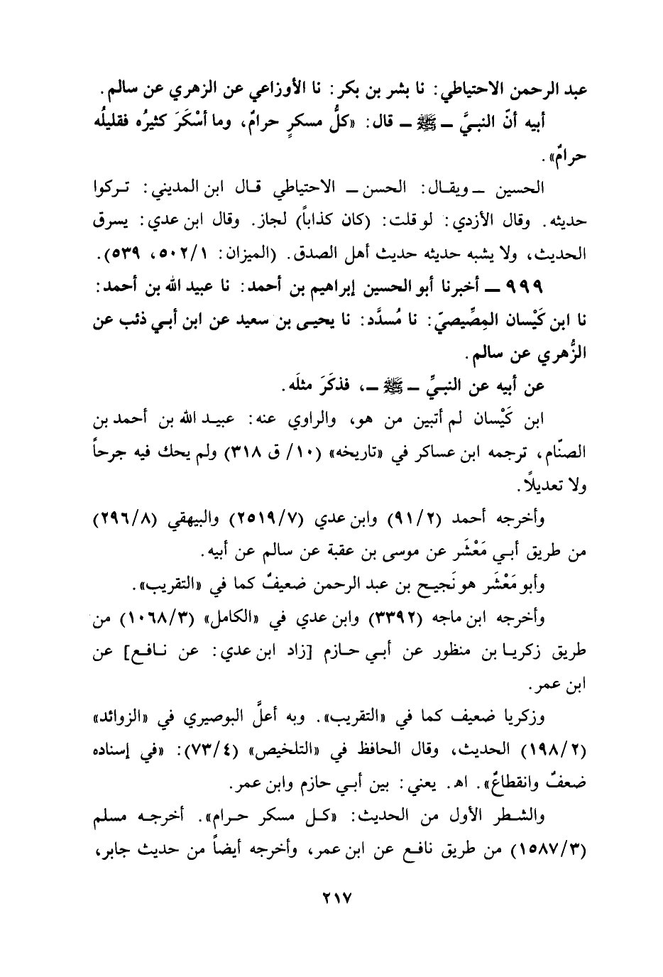 999 - أخبرنا أبو الحسين إبراهيم بن أحمد: نا عبيد الله بن أحمد: نا ابن كَيْسان المِصِّيصيّ: نا مُسدَّد: نا يحيى بن سعيد عن ابن أبي ذئب عن الزُّهري عن سالم.