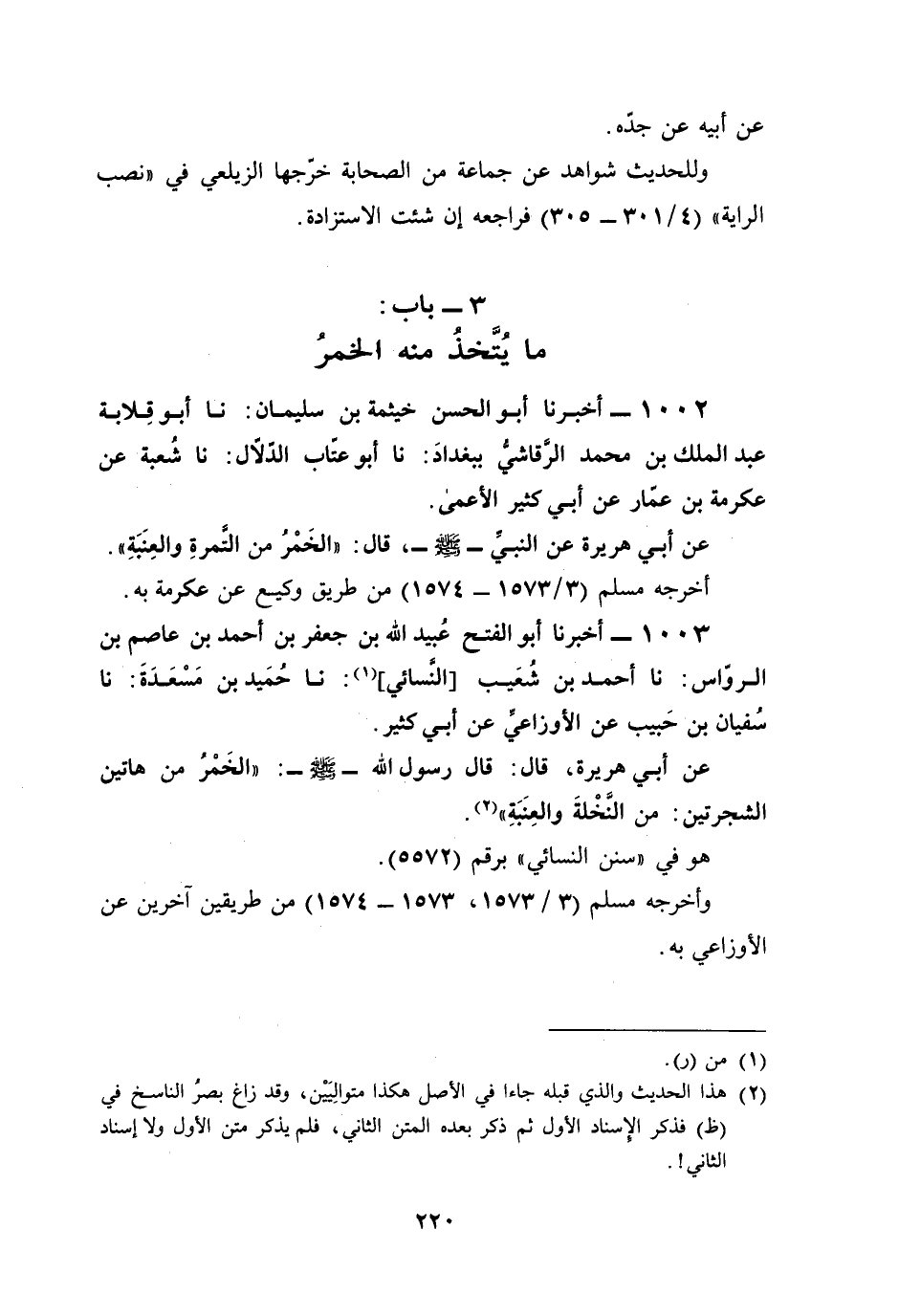 1002 - أخبرنا أبو الحسن خيثمة بن سليمان: نا أبو قِلابة عبد الملك بن محمد الرَّقاشيُّ ببغدادَ: نا أبو عتّاب الدّلّال: نا شُعبة عن عكرمة بن عمّار عن أبي كثير الأعمى.