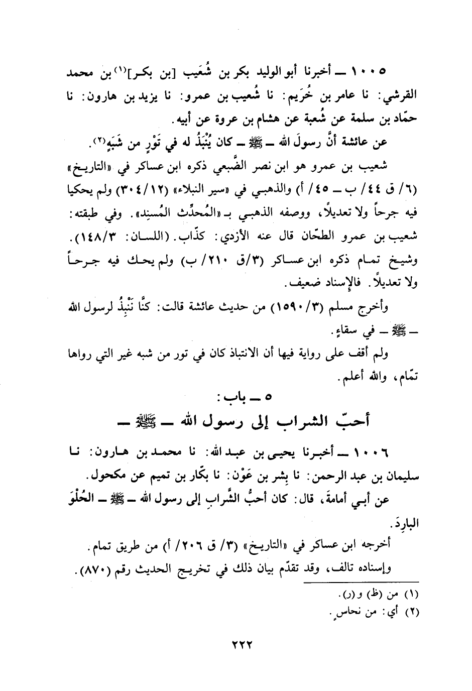 1005 - أخبرنا أبو الوليد بكر بن شُعَيب [بن بكر] (¬1) بن محمد القرشي: نا عامر بن خُرَيم: نا شُعيب بن عمرو: نا يزيد بن هارون: نا حمّاد بن سلمة عن شُعبة عن هشام بن عروة عن أبيه.