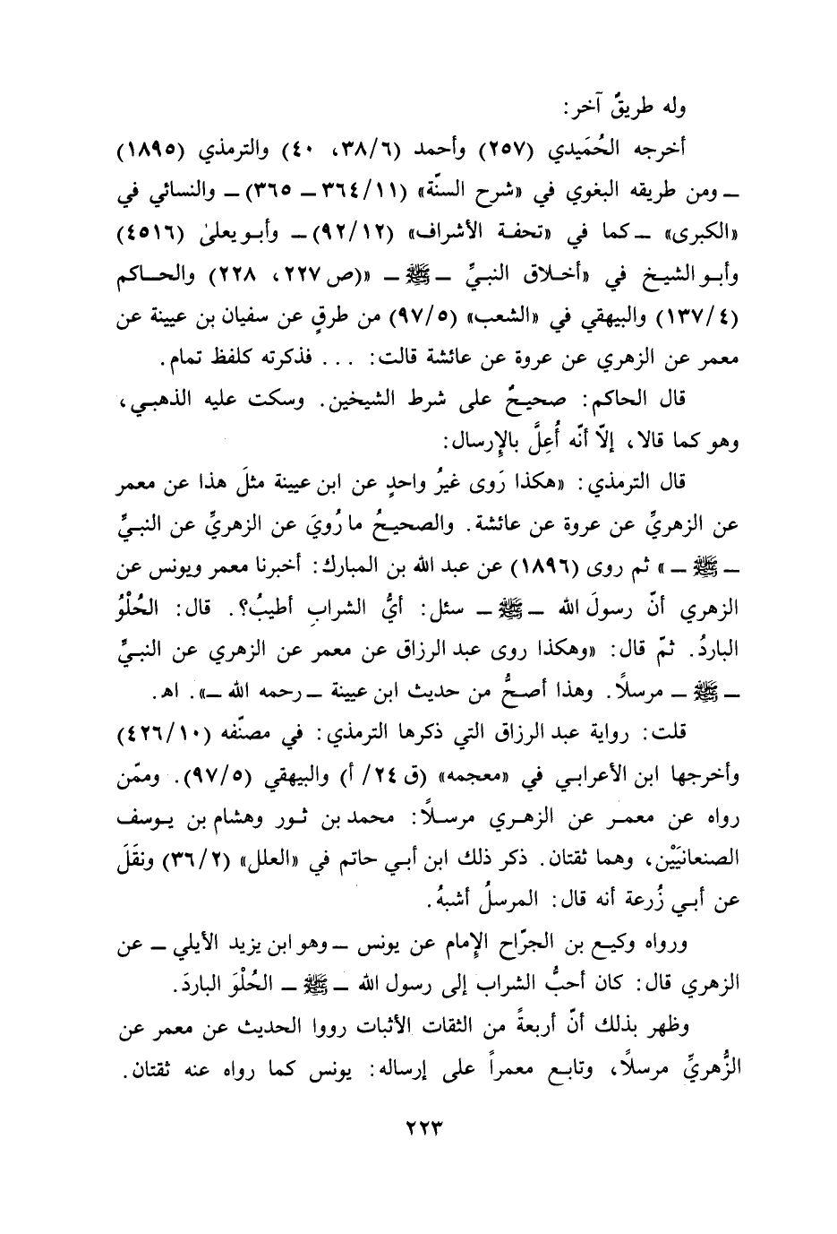 قال الترمذي: "هكذا رَوى غيرُ واحدٍ عن ابن عيينة مثلَ هذا عن معمر عن الزهريِّ عن عروة عن عائشة. والصحيحُ ما رُويَ عن الزهريِّ عن النبيِّ - صلى الله عليه وسلم -" ثم روى (1896) عن عبد الله بن المبارك: أخبرنا معمر ويونس عن الزهري أنّ رسولَ الله - صلى الله عليه وسلم - سئل: أيُّ الشرابِ أطيبُ؟. قال: الحُلْوُ الباردُ. ثمّ قال: "وهكذا روى عبد الرزاق عن معمر عن الزهري عن النبيِّ - صلى الله عليه وسلم - مرسلًا. وهذا أصحُّ من حديث ابن عيينة -رحمه الله-". أهـ.