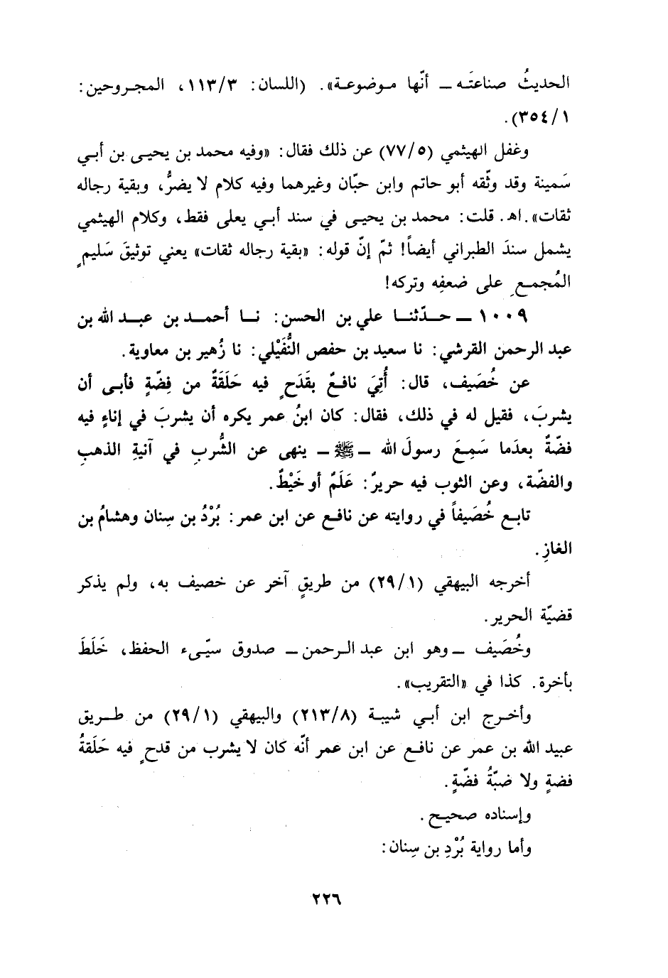 عن خُصَيف، قال: أُتِيَ نافعٌ بقَدَحٍ فيه حَلَقَةٌ من فِضّةٍ فأبى أن يشربَ، فقيل له في ذلك، فقال: كان ابنُ عمر يكره أن يشربَ في إناءٍ فيه فضّةٌ بعدَما سَمِعَ رسولَ الله - صلى الله عليه وسلم - ينهى عن الشُّربِ في آنيةِ الذهبِ والفضّة، وعن الثوب فيه حريرٌ: عَلَمٌ أو خَيْطٌ.
