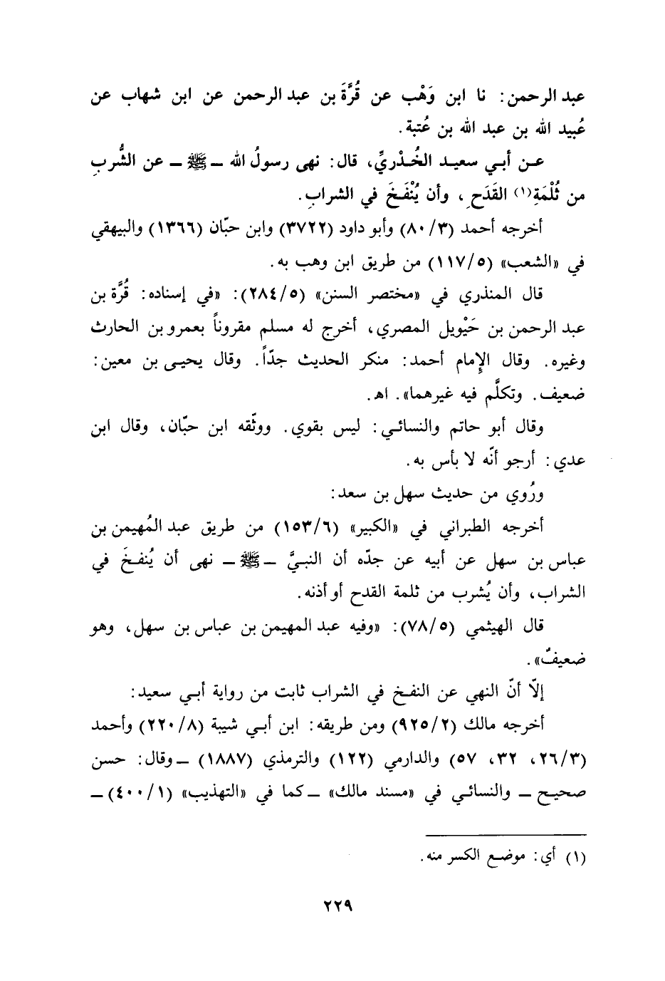 عن أبي سعيد الخُدْريِّ، قال: نهى رسولُ الله - صلى الله عليه وسلم - عن الشُّربِ من ثُلْمَةِ (¬1) القَدَحِ، وأن يُنْفَخَ في الشرابِ.