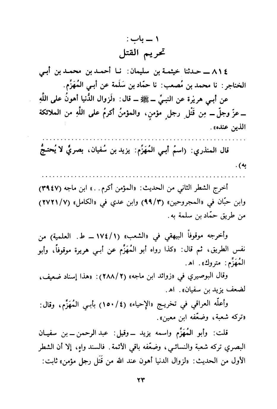 قلت: وأبو المُهَزِّم واسمه يزيد -وقيل: عبد الرحمن- بن سفيان البصري تركه شعبة والنسائي، وضعّفه باقي الأئمة. فالسند واهٍ، إلا أن الشطر الأول من الحديث: "لزوال الدنيا أهون عند الله من قَتل رجل مؤمن" ثابت: