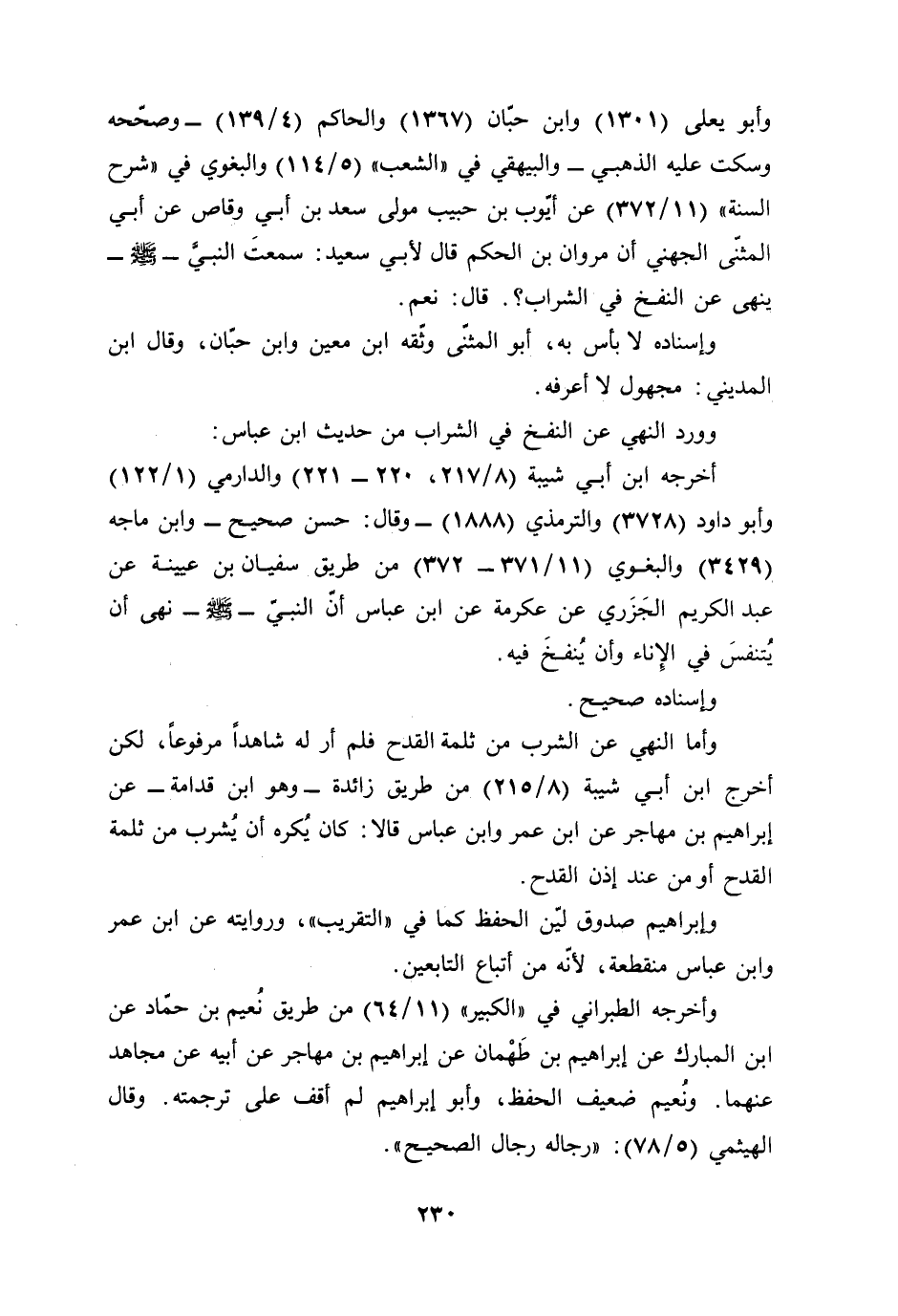 وأبو يعلى (1301) وابن حبّان (1367) والحاكم (4/ 139) -وصحّحه وسكت عليه الذهبي- والبيهقي في "الشعب" (5/ 114) والبغوي في "شرح السنة" (11/ 372) عن أيّوب بن حبيب مولى سعد بن أبي وقاص عن أبي المثنّى الجهني أن مروان بن الحكم قال لأبي سعيد: سمعتَ النبيَّ - صلى الله عليه وسلم - ينهى عن النفخ في الشراب؟. قال: نعم.