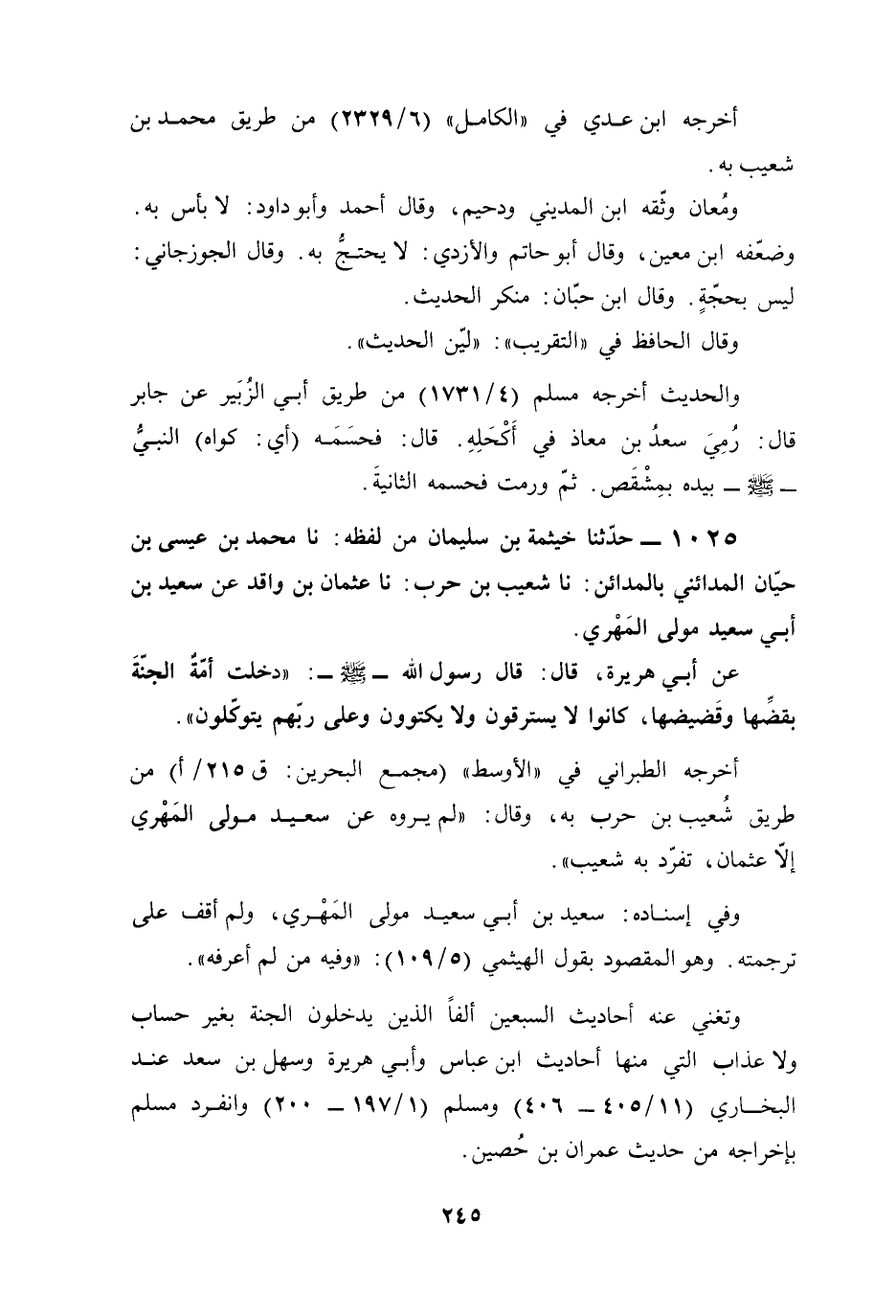 1025 - حدّثنا خيثمة بن سليمان من لفظه: نا محمد بن عيسى بن حيّان المدائني بالمدائن: نا شعيب بن حرب: نا عثمان بن واقد عن سعيد بن أبي سعيد مولى المَهْري.