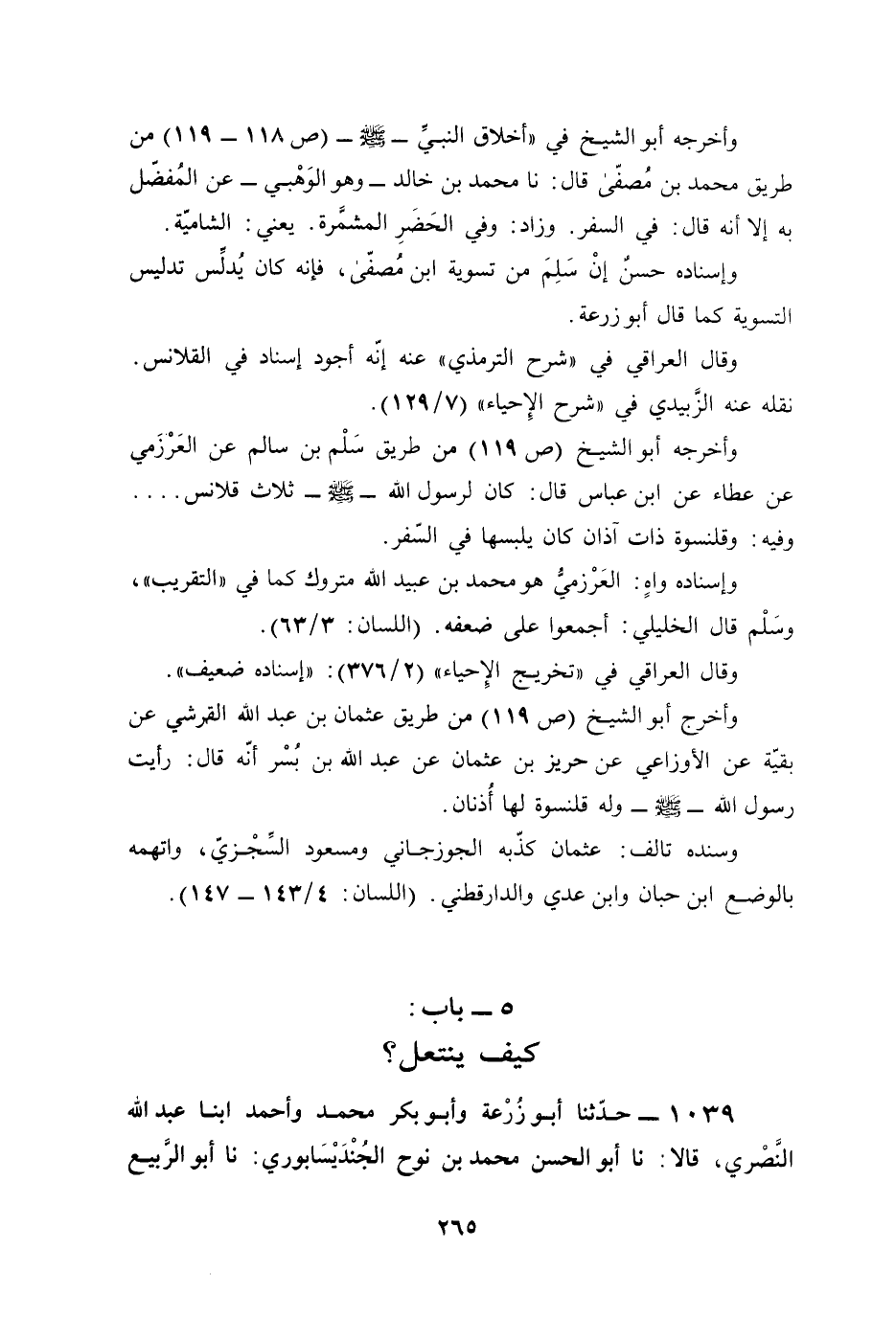 وأخرجه أبو الشيخ في "أخلاق النبيِّ -صلى الله عليه وسلم- (ص118 - 119) من طريق محمد بن مُصفّى قال: نا محمد بن خالد -وهو الوَهْبي- عن المُفضّل به إلا أنه قال: في السفر. وزاد: وفي الحَضَرِ المشمَّرة. يعني: الشاميّة.