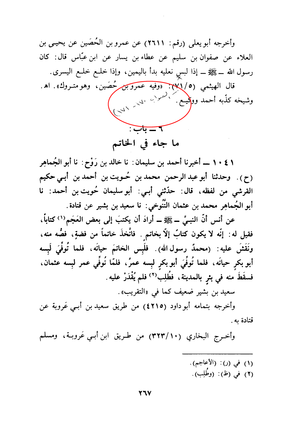 1041 - أخبرنا أحمد بن سليمان: نا خالد بن رَوْح: نا أبو الجُماهِر (ح). وحدثنا أبو عبد الرحمن محمد بن حُويت بن أحمد بن أبي حكيم القرشي من لفظه، قال: حدّثني أبي: أبو سليمان حُويت بن أحمد: نا أبو الجُماهِر محمد بن عثمان التَّنُوخي: نا سعيد بن بشير عن قتادة.