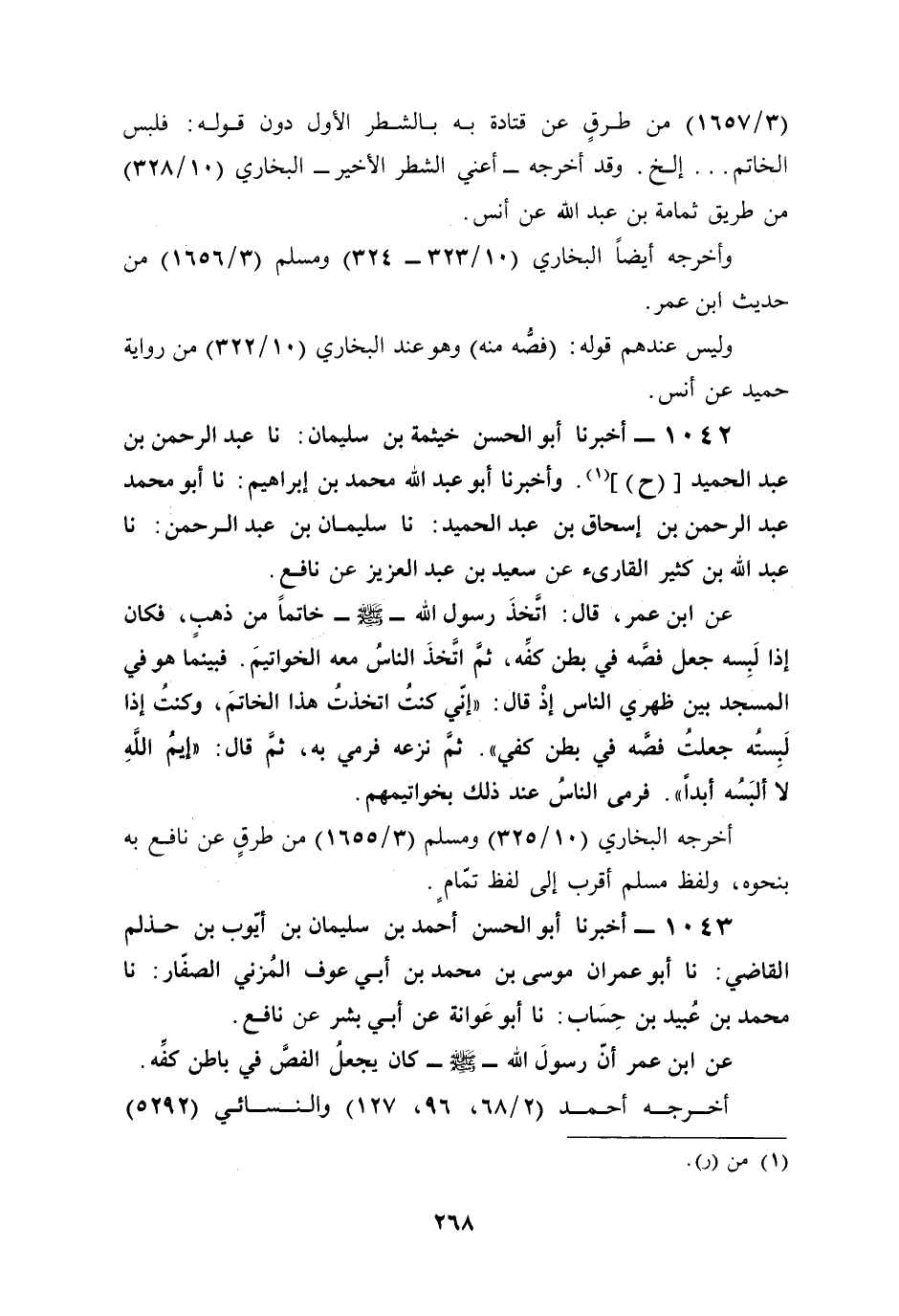 1043 - أخبرنا أبو الحسن أحمد بن سليمان بن أيّوب بن حذلم القاضي: نا أبو عمران موسى بن محمَّد بن أبي عوف المُزني الصفّار: نا محمد بن عُبيد بن حِسَاب: نا أبو عَوانة عن أبي بشر عن نافع.
