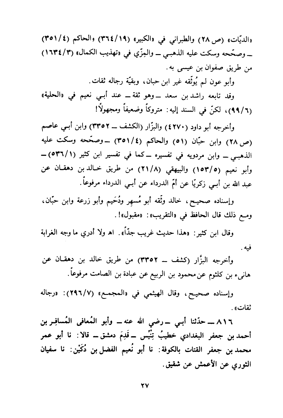 816 - حدّثنا أبي -رضي الله عنه - وأبو المُعافى المُسافِر بن أحمد بن جعفر البغدادي خطيبُ تِنْيِّس -قَدِمَ دمشق- قالا: نا أبو عمر محمد بن جعفر القتات بالكوفة: نا أبو نُعيم الفضل بن دُكَيْن: نا سفيان الثوري عن الأعمش عن شقيق.