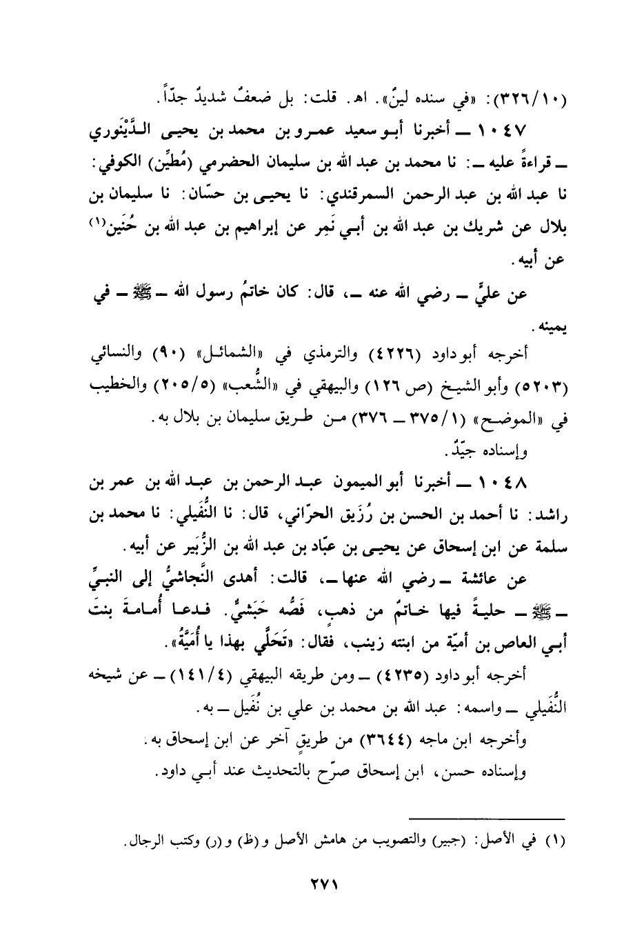 1047 - أخبرنا أبو سعيد عمرو بن محمد بن يحيى الدَّيْنَوري -قراءةً عليه-: نا محمد بن عبد الله بن سليمان الحضرمي (مُطيِّن) الكوفي: نا عبد الله بن عبد الرحمن السمرقندي: نا يحيى بن حسّان: نا سليمان بن بلال عن شريك بن عبد الله بن أبي نَمِر عن إبراهيم بن عبد الله بن حُنَين (¬1) عن أبيه.