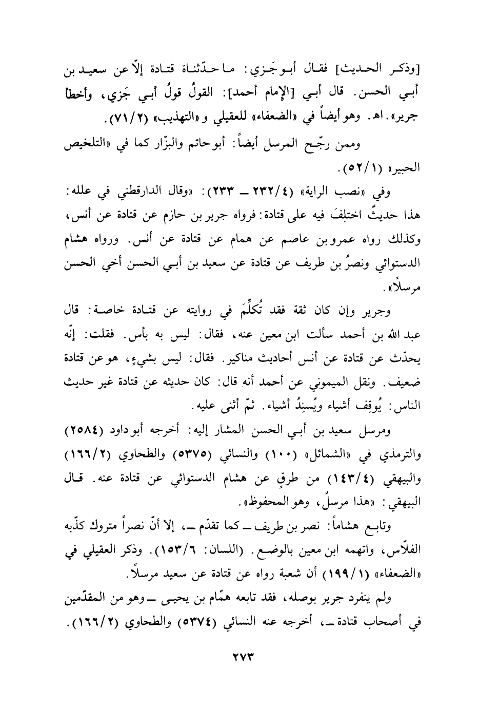 وفي "نصب الراية" (4/ 232 - 233): "وقال الدارقطني في علله: هذا حديثٌ اختلِفَ فيه على قتادة: فرواه جرير بن حازم عن قتادة عن أنس، وكذلك رواه عمرو بن عاصم عن همام عن قتادة عن أنس. ورواه هشام الدستوائي ونصرُ بن طريف عن قتادة عن سعيد بن أبي الحسن أخي الحسن مرسلًا".