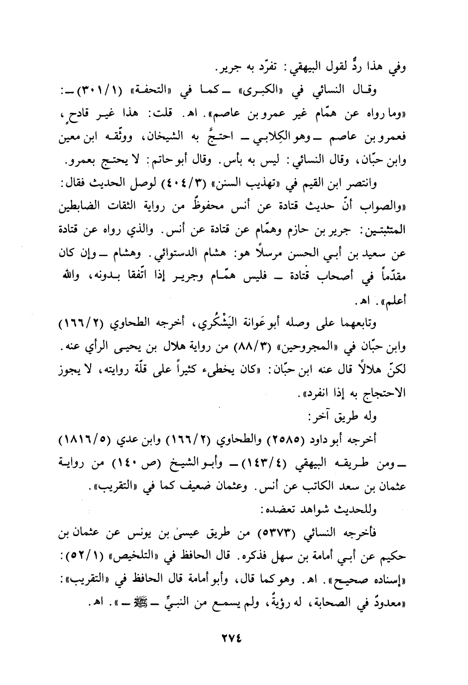 وقال النسائي في "الكبرى" -كما في "التحفة " (1/ 301) -: "وما رواه عن همّام غير عمرو بن عاصم". أهـ. قلت: هذا غير قادحٍ، فعمرو بن عاصم -وهو الكِلابي- احتجَّ به الشيخان، ووثّقه ابن معين وابن حبّان، وقال النسائي: ليس به بأس. وقال أبو حاتم: لا يحتج بعمرو.