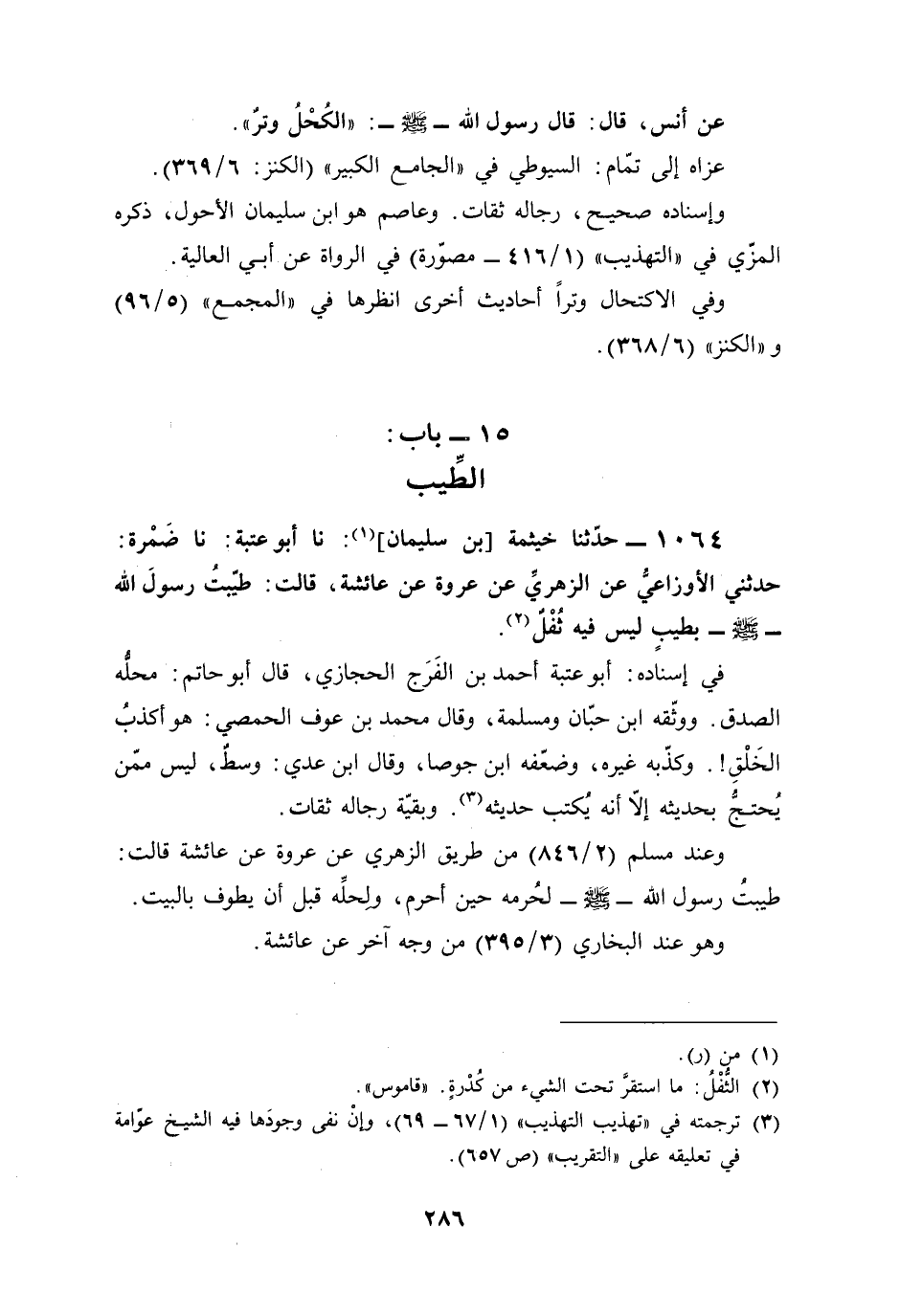 1064 - حدّثنا خيثمة [بن سليمان] (¬1): نا أبو عتبة: نا ضَمْرة: حدثني الأوزاعيُّ عن الزهريِّ عن عروة عن عائشة، قالت: طيّبتُ رسولَ الله -صلى الله عليه وسلم- بطيبٍ ليس فيه ثُفْلٌ (¬2).