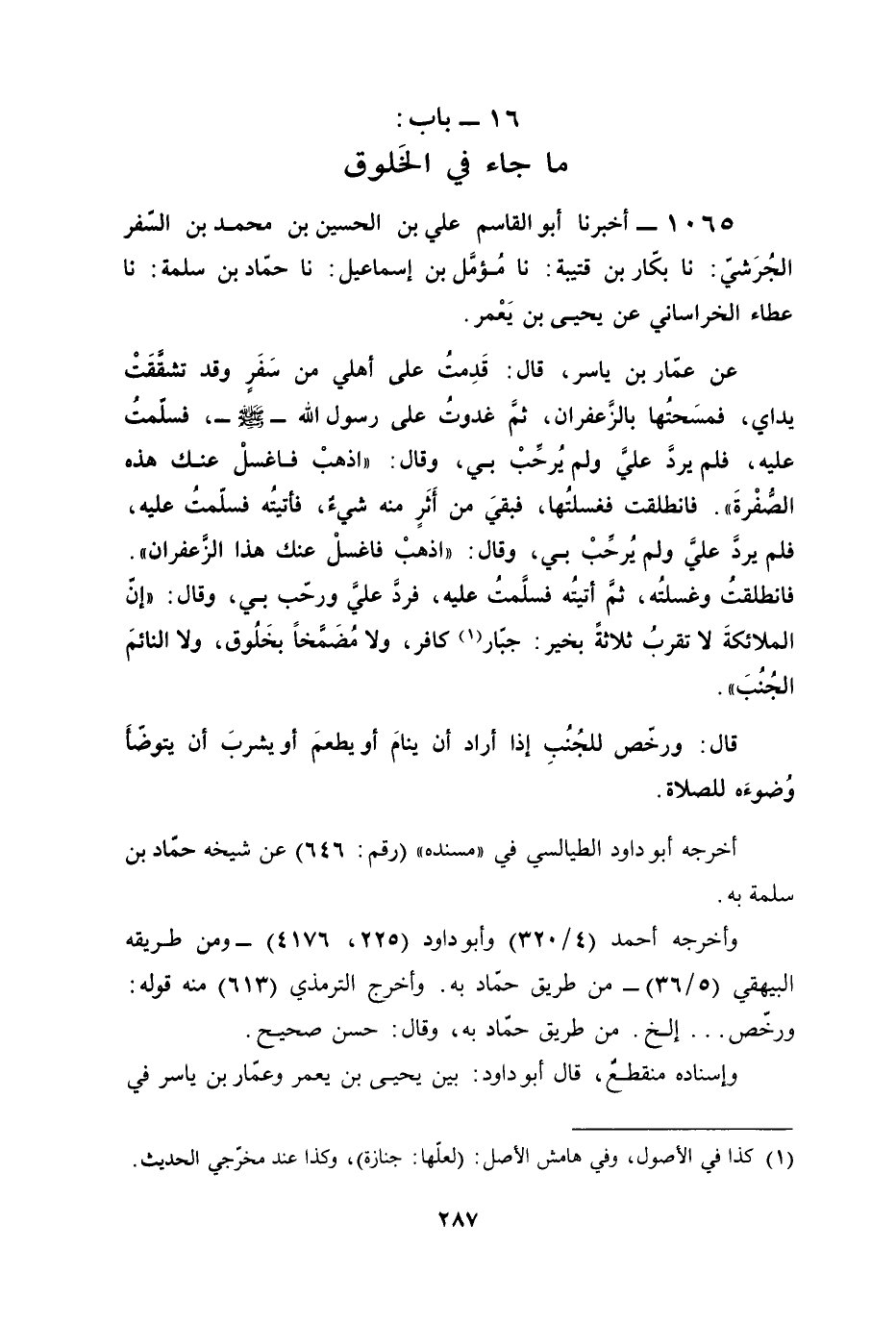 1065 - أخبرنا أبو القاسم علي بن الحسين بن محمد بن السّفر الجُرَشيّ: نا بكّار بن قتيبة: نا مُؤمَّل بن إسماعيل: نا حمّاد بن سلمة: نا عطاء الخراساني عن يحيى بن يَعْمر.