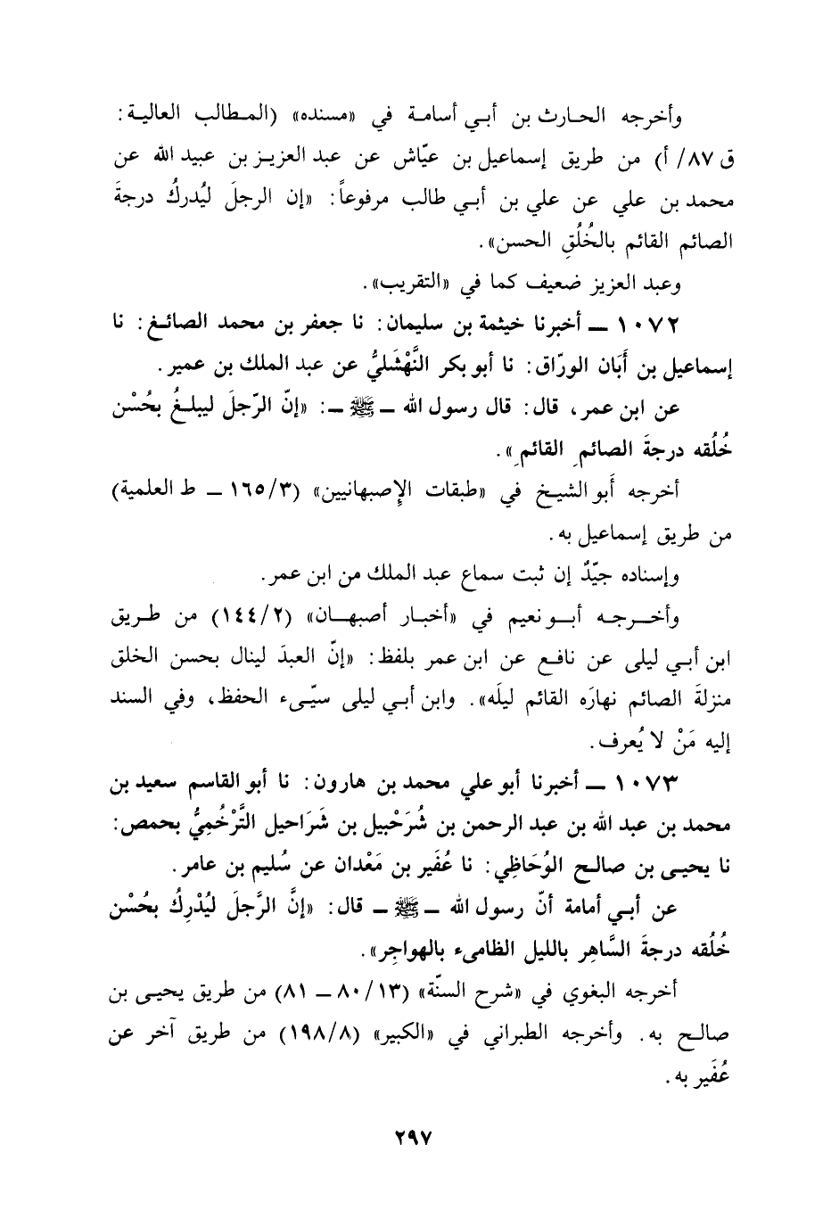 وأخرجه الحارث بن أبي أسامة في "مسنده" (المطالب العالية: ق 87/ أ) من طريق إسماعيل بن عيّاش عن عبد العزيز بن عبيد الله عن محمَّد بن علي عن علي بن أبي طالب مرفوعًا: "إن الرجلَ ليُدركُ درجةَ الصائم القائم بالخُلُقِ الحسن".