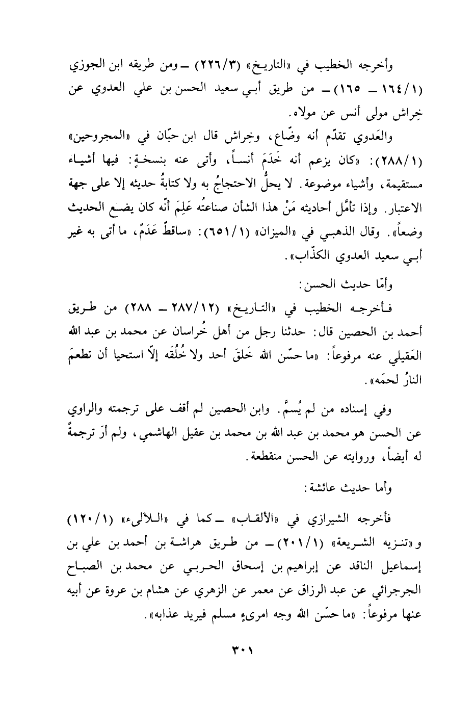 فأخرجه الشيرازي في "الألقاب" -كما في "اللآلىء" (1/ 120) و"تنزيه الشريعة" (1/ 201) - من طريق هراشة بن أحمد بن علي بن إسماعيل الناقد عن إبراهيم بن إسحاق الحربي عن محمد بن الصباح الجرجرائي عن عبد الرزاق عن معمر عن الزهري عن هشام بن عروة عن أبيه عنها مرفوعًا: "ما حسّن الله وجه امرىءٍ مسلم فيريد عذابه".