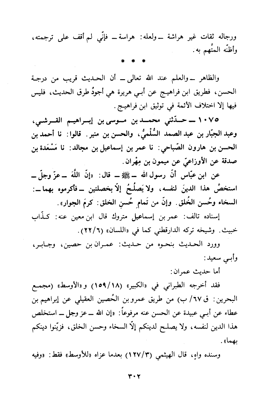 1075 - حدّثني محمد بن موسى بن إبراهيم القرشي، وعبد الجبّار بن عبد الصمد السُّلْميُّ، والحسن بن منير. قالوا: نا أحمد بن الحسن بن هارون الصّباحي: نا عمر بن إسماعيل بن مجالد: نا مَسْعَدة بن صدقة عن الأوزاعيّ عن ميمون بن مِهْران.