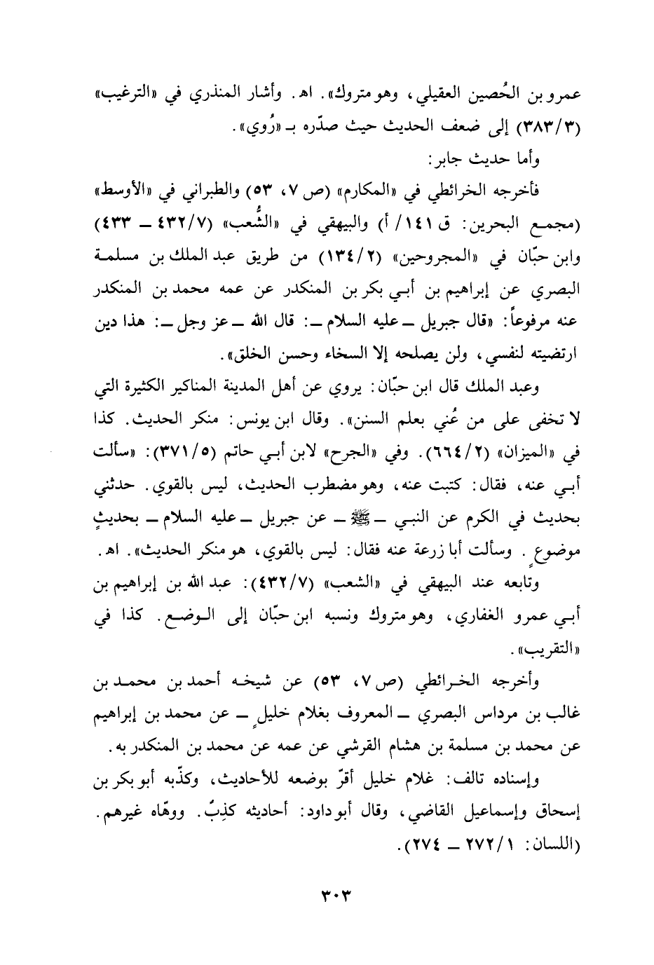 فأخرجه الخرائطي في "المكارم" (ص 7، 53) والطبراني في "الأوسط" (مجمع البحرين: ق 141/ أ) والبيهقي في "الشُّعب" (7/ 432 - 433) وابن حبّان في "المجروحين" (2/ 134) من طريق عبد الملك بن مسلمة البصري عن إبراهيم بن أبي بكر بن المنكدر عن عمه محمد بن المنكدر عنه مرفوعًا: "قال جبريل -عليه السلام-: قال الله -عَزَّ وجَلَّ-: هذا دين ارتضيته لنفسي، ولن يصلحه إلا السخاء وحسن الخلق".