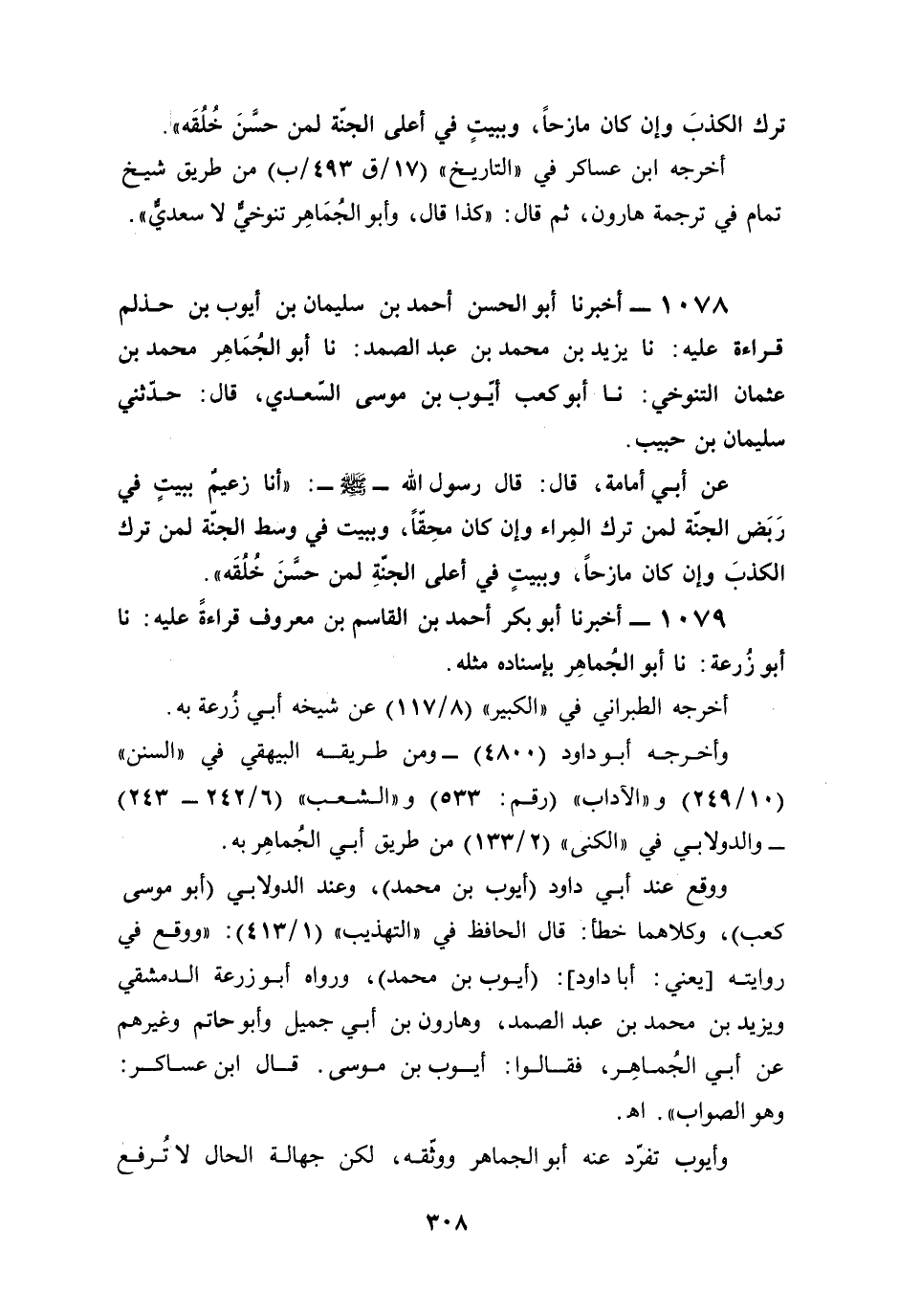 وأيوب تفرّد عنه أبو الجماهر ووثّقه، لكن جهالة الحال لا تُرفع