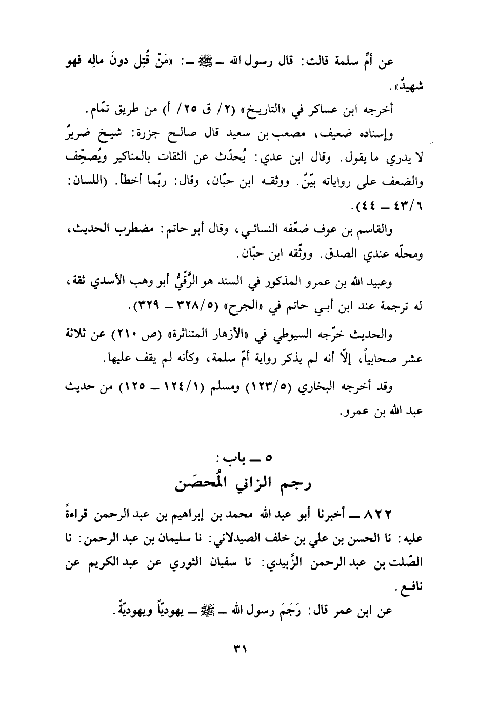 822 - أخبرنا أبو عبد الله محمَّد بن إبراهيم بن عبد الرحمن قراءةً عليه: نا الحسن بن علي بن خلف الصيدلاني: نا سليمان بن عبد الرحمن: نا الصّلت بن عبد الرحمن الزَّبيدي: نا سفيان الثوري عن عبد الكريم عن نافع.