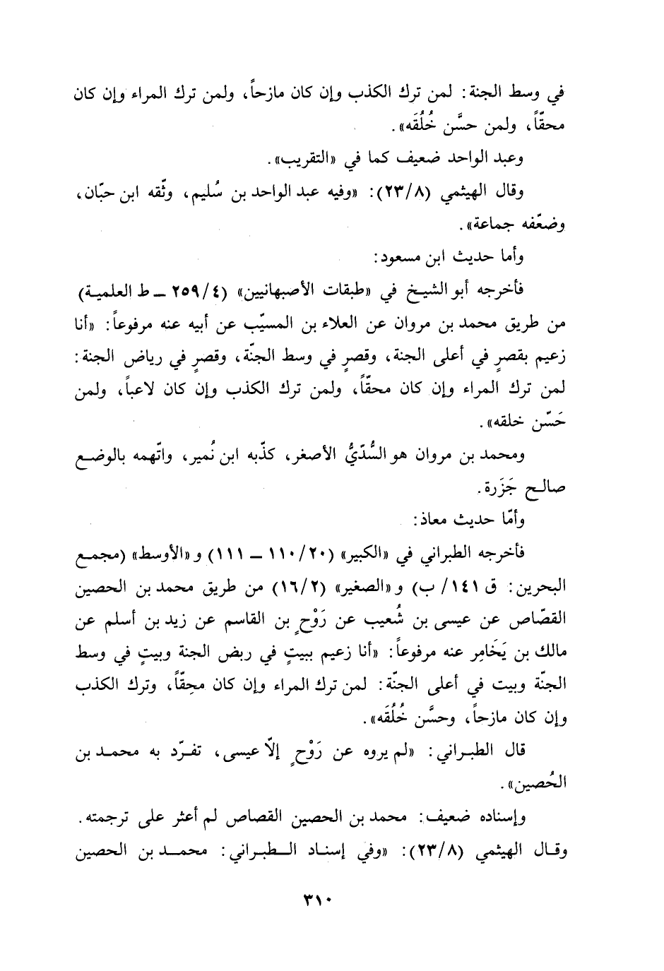 فأخرجه الطبراني في "الكبير" (20/ 110 - 111) و"الأوسط" (مجمع البحرين: ق 141/ ب) و"الصغير" (2/ 16) من طريق محمد بن الحصين القصّاص عن عيسى بن شُعيب عن رَوْحٍ بن القاسم عن زيد بن أسلم عن مالك بن يَخَامِر عنه مرفوعًا: "أنا زعيم ببيتٍ في ربض الجنة وبيتٍ في وسط الجنّة وبيت في أعلى الجنّة: لمن ترك المراء وإن كان محِقًّا، وترك الكذب وإن كان مازحًا، وحسَّن خُلُقَه".